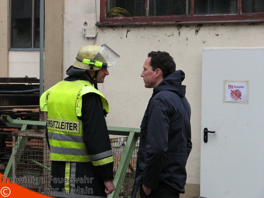 Während eines Arbeitsprozesses geriet eine Maschine in einem Sägewerk in Brand. Mitarbeiter unternahmen erste Löschversuche mittels Pulverlöscher und verließen die völlig verrauchte Halle. Durch die eingebaute Brandmeldeanlage wurde die Leitstelle sofort automatisch verständigt und die FF Lohr alarmiert. Nach Bestätigung des Feuers durch einen Anrufer wurde eine Alarmerhöhung vorgenommen.