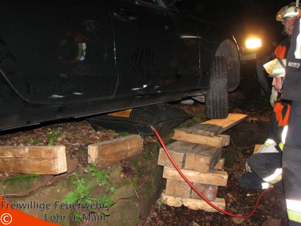 Der PKW war mit dem rechten Vorderrad in den Graben gerutscht und saß mit der Vorderachse auf einer Sandsteinmauer (Wasserdurchlass) auf. Die Feuerwehr hob das Fahrzeug mit einem Hebekissen an und unterbaute das Vorderrad. Anschließend wurde das Fahrzeug mit der Seilwinde aus dem Graben gezogen.