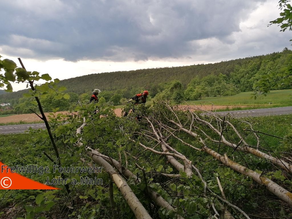 Die Feuerwehren aus Lohr und Steinbach wurden zu einem umgestürzten Baum auf die St 2437 Höhe Sportplatz Sendelbach alarmiert.