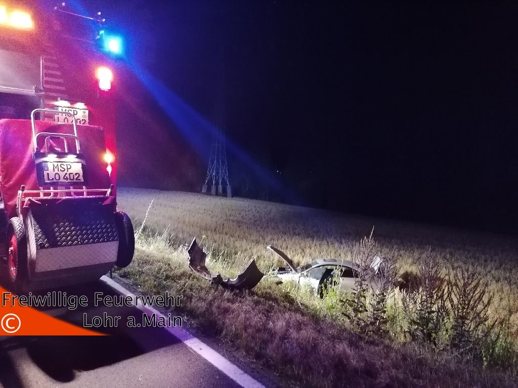 Die Feuerwehre Lohr und Sackenbach wurden in den frühen Morgenstunden zu einem verunfallten, brennenden PKW am Ortsausgang Sackenbach Richtung Neuendorf alarmiert.