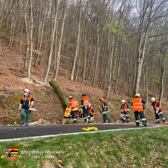Aus Lohr sind Kommandowagen, Mannschaftstransportwagen, Rüstwagen Unwetter, Drehleiter und das Hilfeleistungslöschgruppenfahrzeug ausgerückt. Mittels MTW wurde eine Straßensperre in Sendelbach errichtet. Das HLF übernahm die Verkehrssicherung am Ortsausgang Sendelbach und die sägetechnischen Arbeiten am Baum. Der RW sicherte mittels Seilwinde den Baum. Die Drehleiter hatte den Auftrag einen Festpunkt am Baum zu schaffen. Die Feuerwehr Pflochsbach übernahm die Verkehrssicherung seitens Pflochsbach. Nachdem die Arbeiten einige Zeit in Anspruch nahmen, kam es zu leichten Verkehrsbehinderungen. Diese ließen sich jedoch nicht vermeiden. Nachdem der Baum umgelegt war, konnten die Aufräumarbeiten durchgeführt werden. Anschließend wurde die Straße freigegeben.