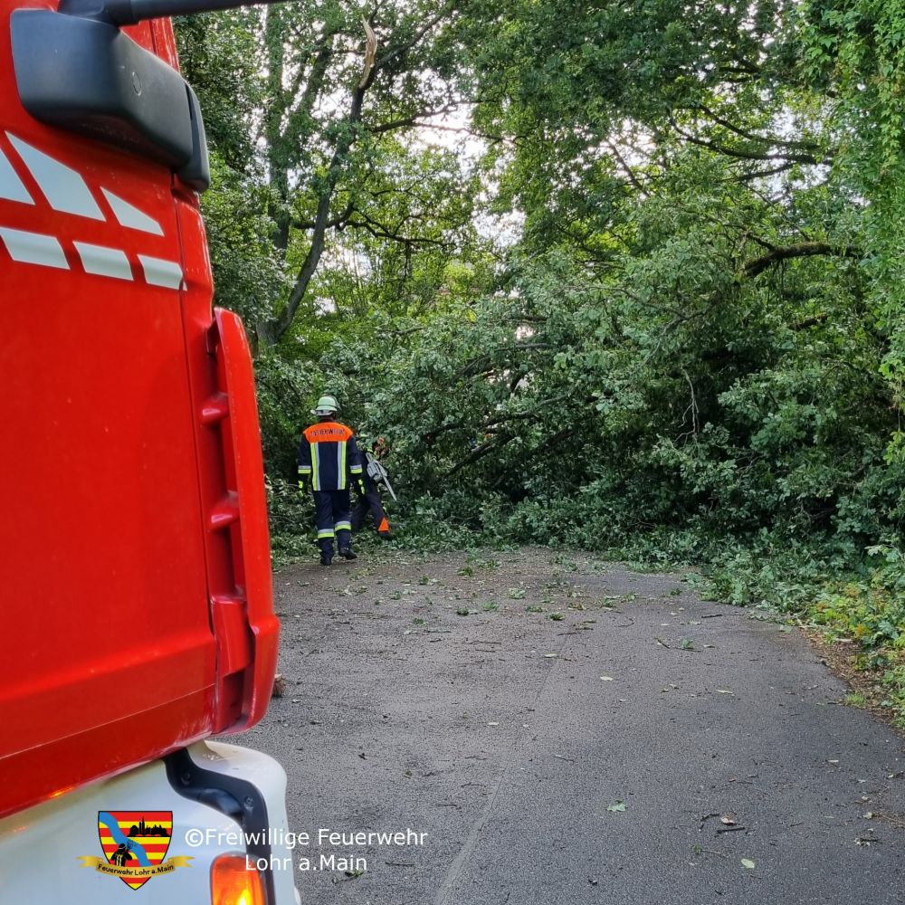 Zwei große Bäume waren auf der Willi-Bleicher-Str. umgefallen. Die Feuerwehren aus Lohr und Lohr-Sackenbach beseitigten die Bäume mittels Kettensäge und reinigten die Fahrbahn grob.