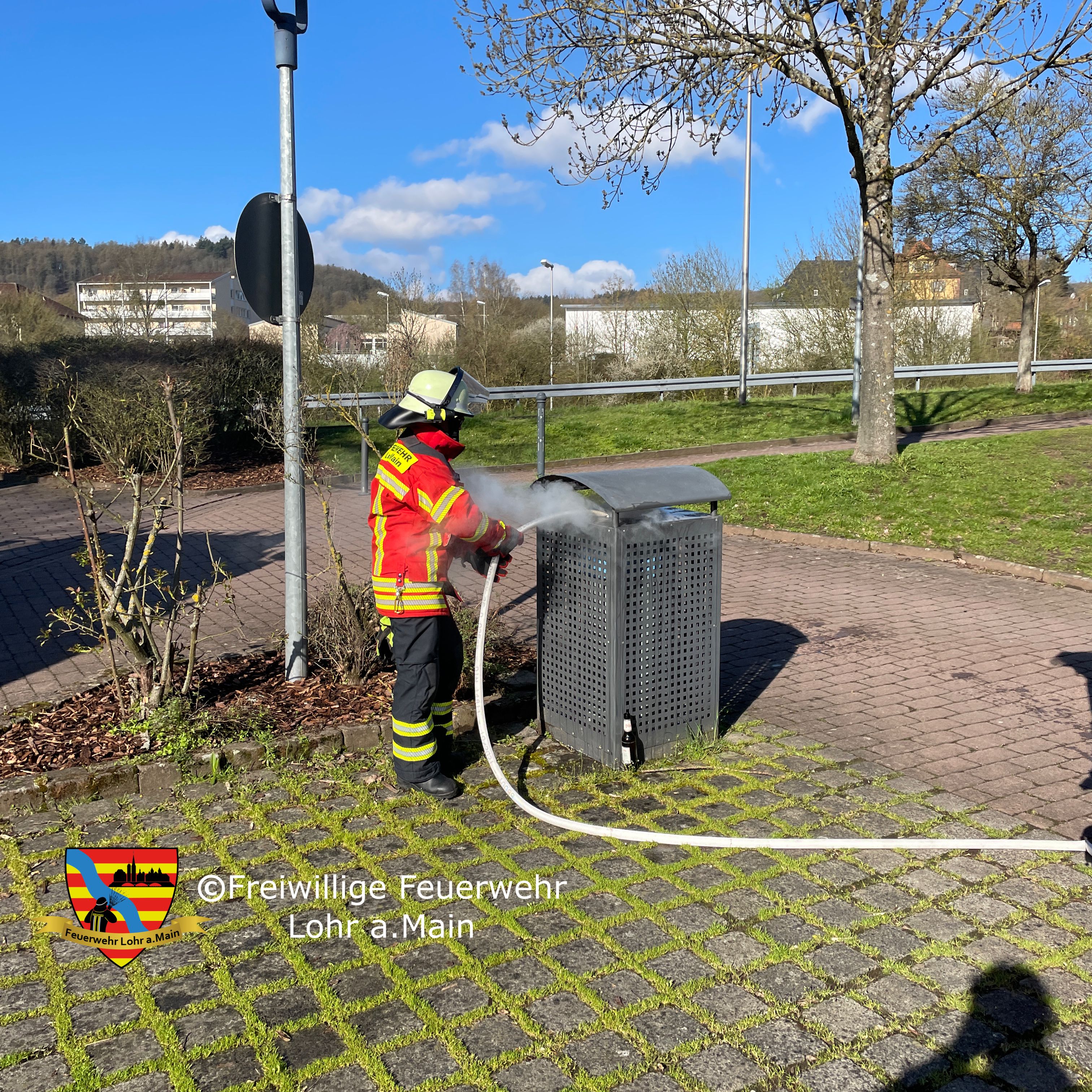Die Feuerwehr Lohr wurde zu einem brennenden Abfallkorb auf dem Parkplatz der Spessarttorhalle alarmiert. Der Behälter wurde mittels Kübelspritze abgelöscht.