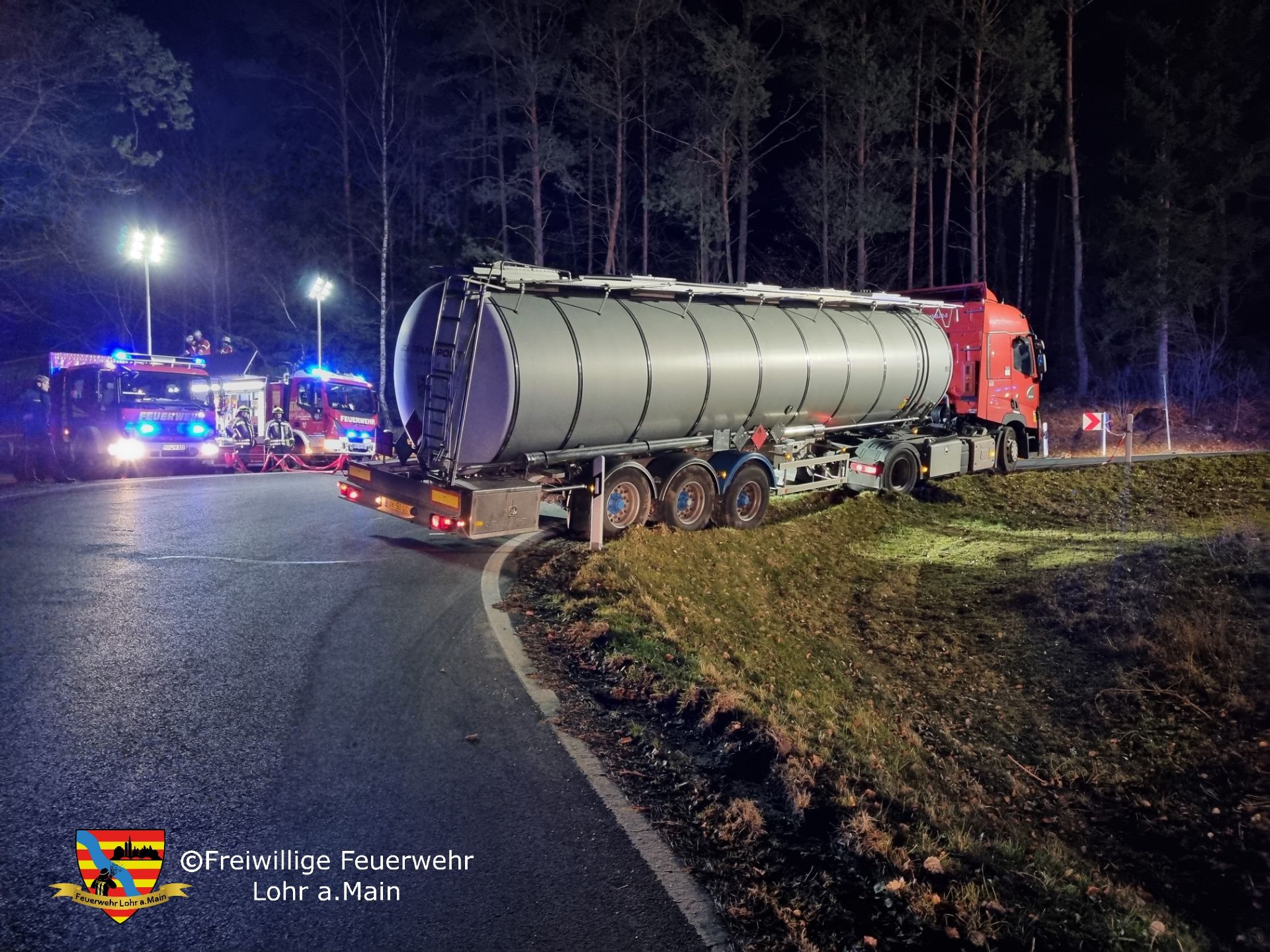 Die Feuerwehr Lohr wurde zur Unterstützung nach Habichsthal alarmiert. Ein LKW mit Gefahrgut war hier in den Graben gerutscht und drohte zu kippen.