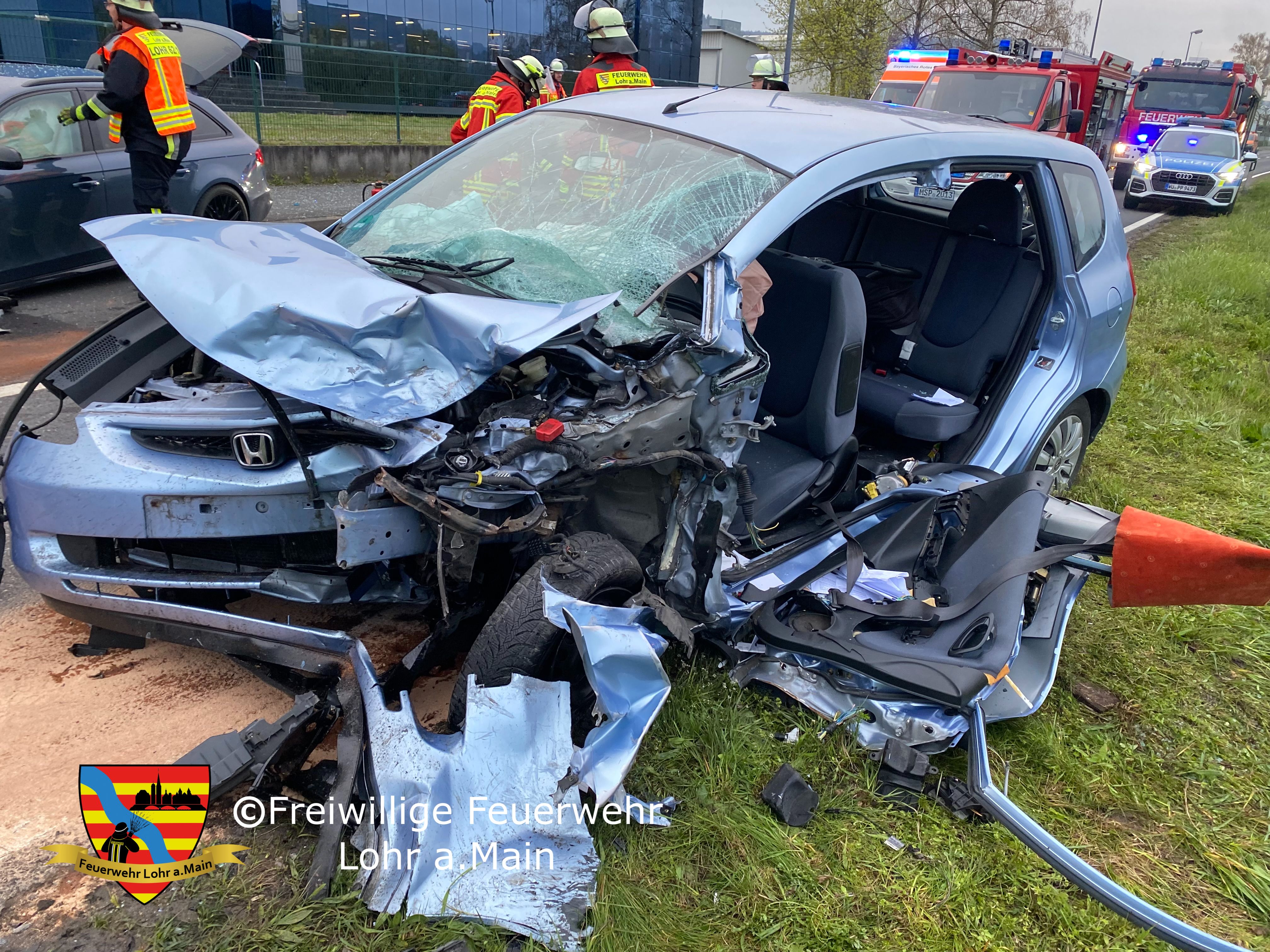 Die Einsatzkräfte der Feuerwehr Lohr, Rodenbach und Neustadt wurden zu einem Verkehrsunfall auf der Rodenbacher Str. Höhe Firma Hunger alarmiert. Eine erste Lage ergab zwei frontal miteinander kollidierte PKW. Der Fahrer des ersten PKW hatte das Fahrzeug selbstständig verlassen können. Der Fahrer des anderen PKWs war auf dem Fahrersitz befindlich eingeklemmt und musste mittels hydraulischen Rettungsgeräts befreit werden.