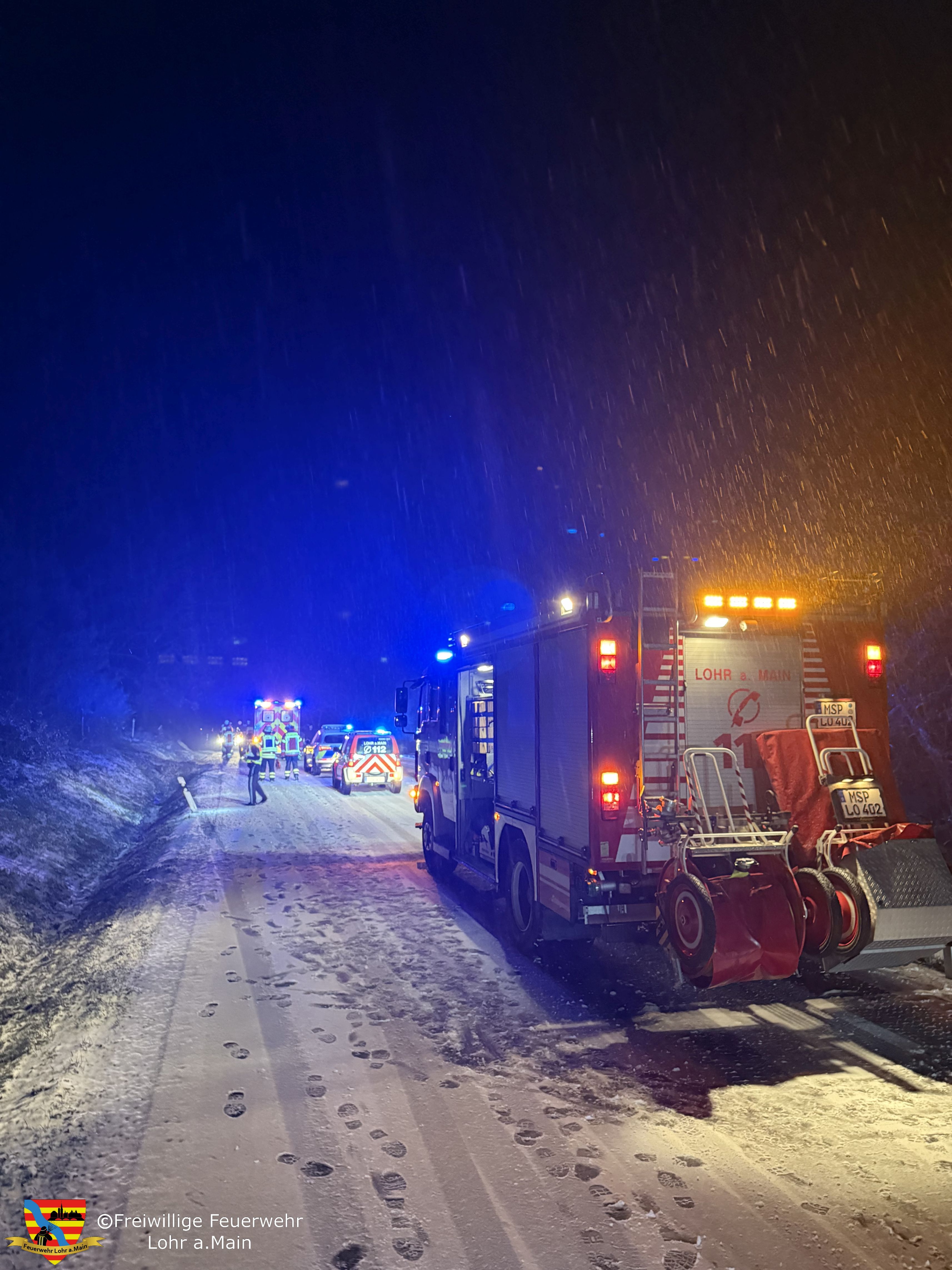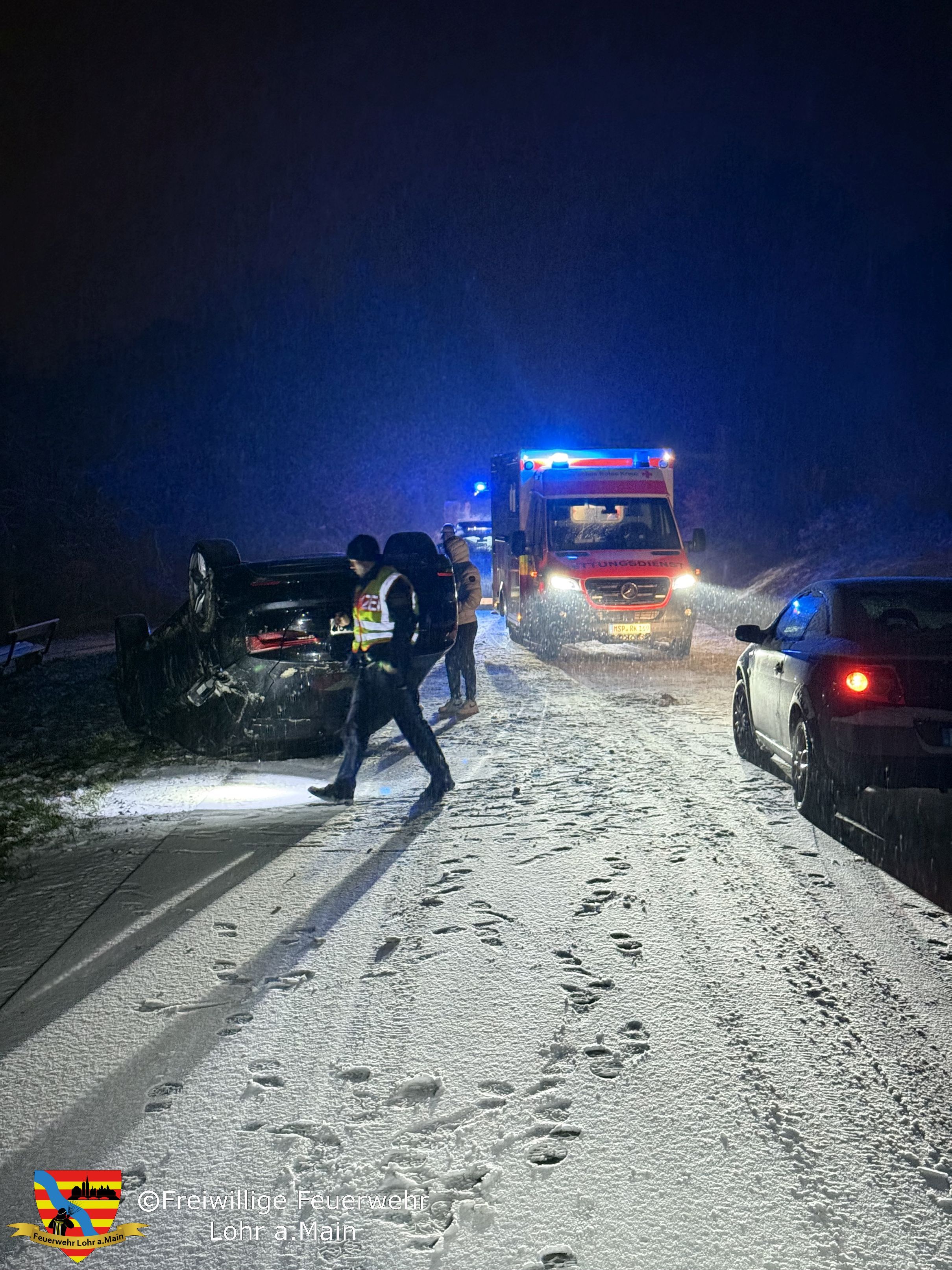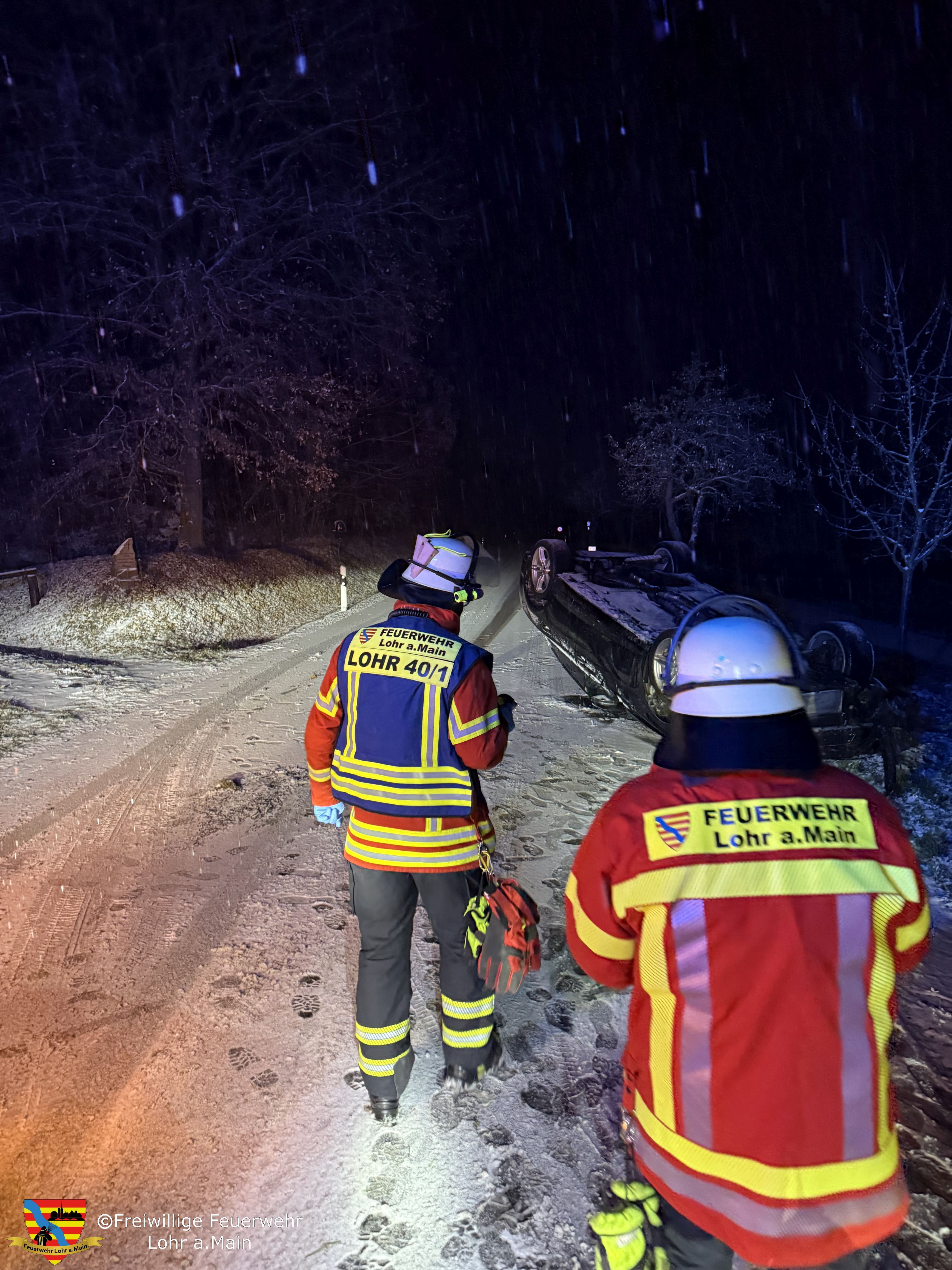 Ein PKW war während Schneefall in den Graben gerutscht und an einen Durchlass gefahren. Durch die Wucht hat sich der PKW überschlagen und ist auf dem Dach auf der Fahrbahn zum liegen gekommen.