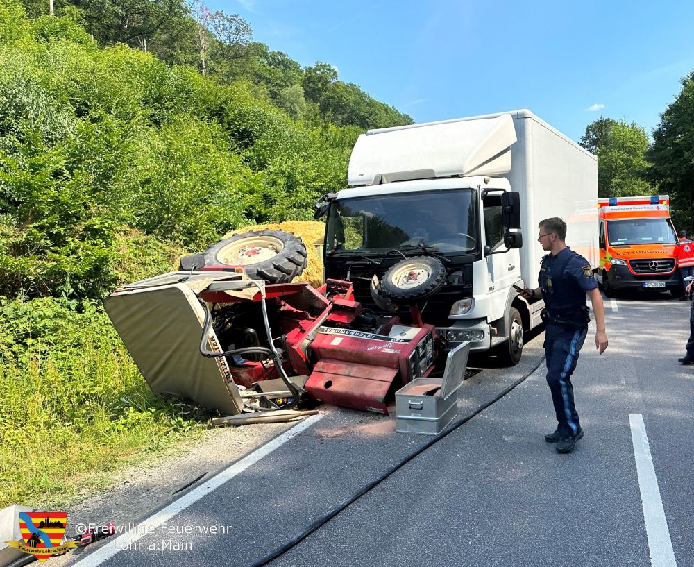 Die Feuerwehren Lohr und Partenstein wurden auf die B276 zwischen Lohr und Partenstein zu einem Verkehrsunfall mit einem Traktor alarmiert.