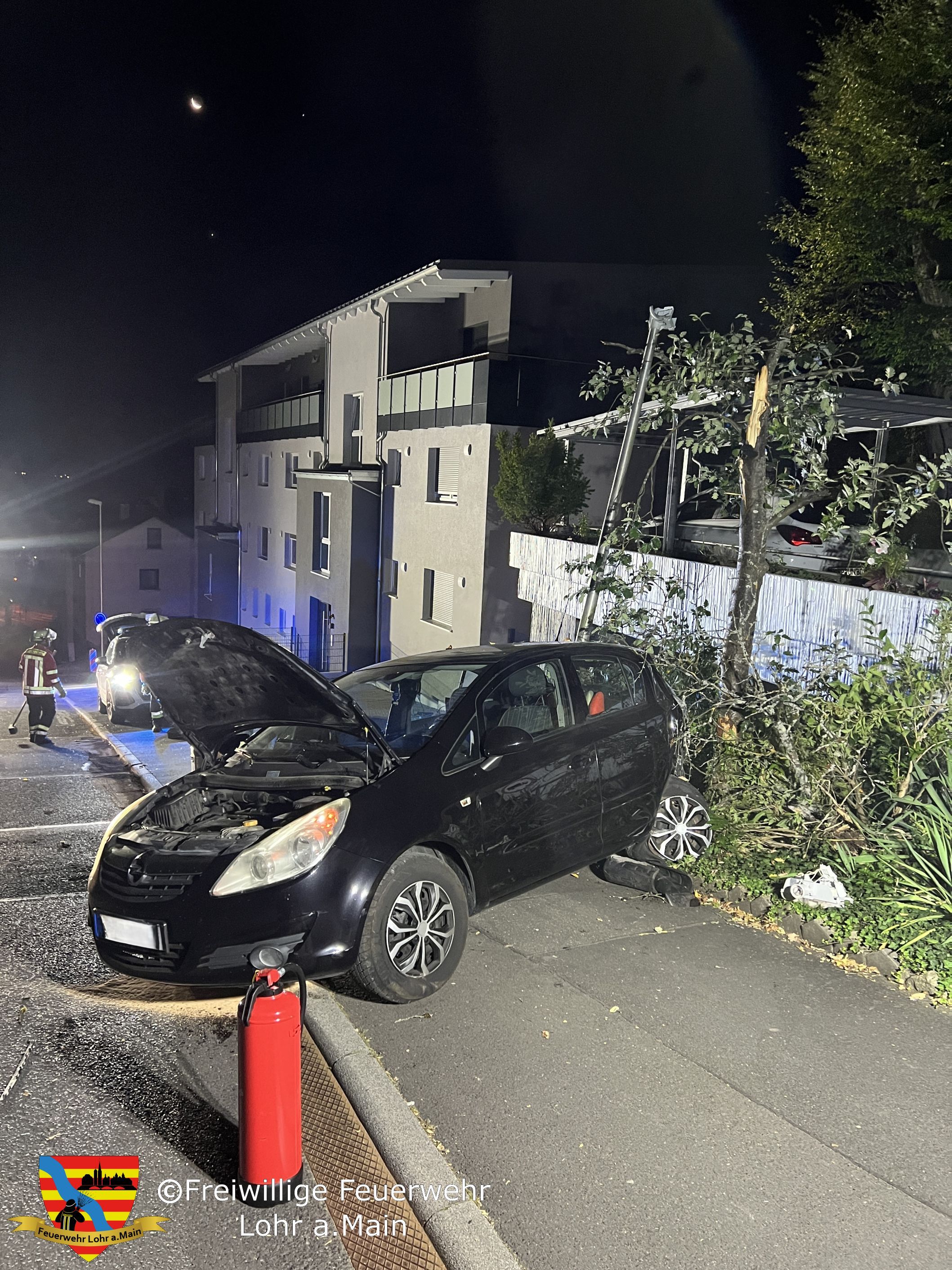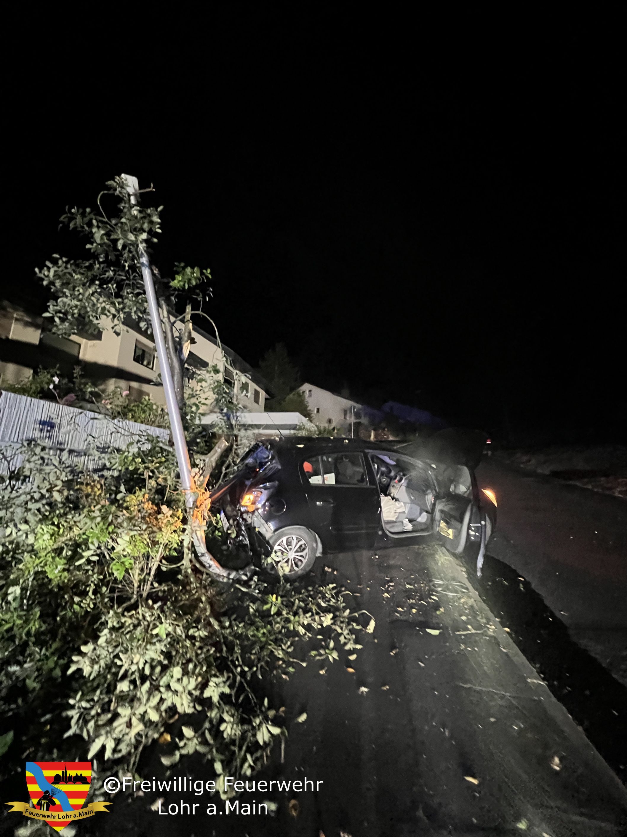 Ein Pkw war rückwärts gegen eine Straßenlaterne und einen Baum gefahren. Die Ölwanne wurde aufgerissen, und Öl lief ca. 40 Meter hangabwärts.