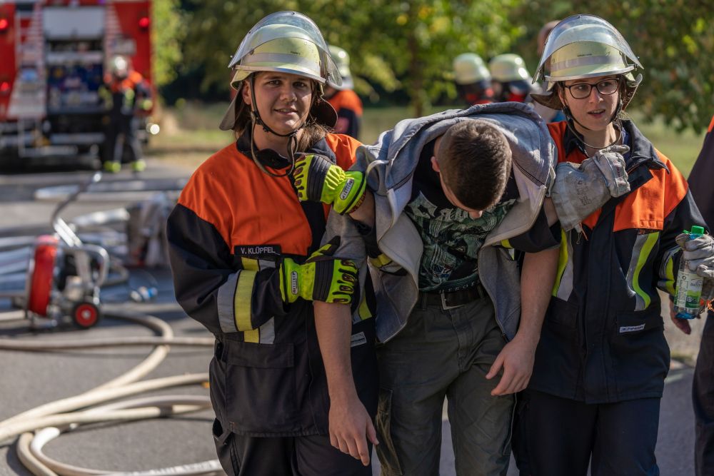 Die ganzen Übungsszenarien wurden erst durch die Statisten richtig mit Leben gefüllt. Es ist ein Unterschied, ob eine Übungspuppe gerettet werden muss oder ein Darsteller, der einen stark gehbehinderten „Senioren“ mimt. Hier ein herzliches Dankeschön an unsere „Opfer-Darsteller“, die eine hervorragende schauspielerische Leistung abgeliefert haben.