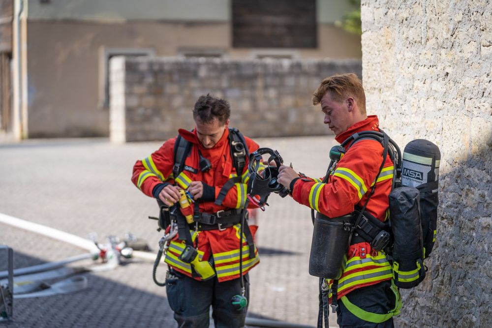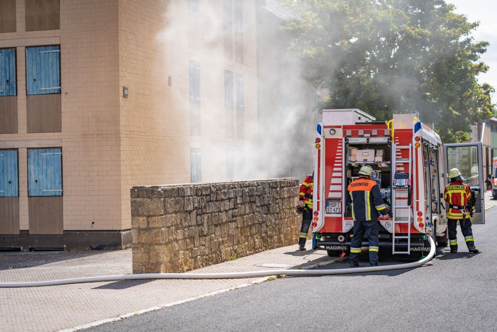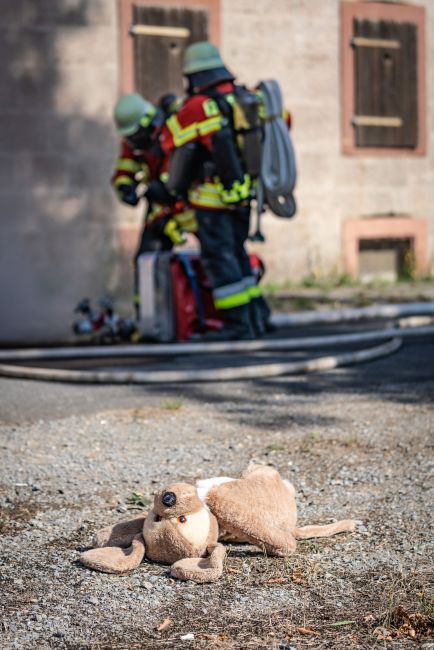Bei der zweiten Übung handelte es sich um eine angenommene Gemeinschaftsunterkunft für ausländische Mitbürger. Das Treppenhaus war durch einen Kellerbrand verraucht und die Personen hatten sich auf Balkone geflüchtet. Hier galt es, unter Einsatz mehrerer tragbaren Leitern, die Personen zu retten, und gleichzeitig den Brand im Keller zu bekämpfen. Die Sprachbarriere war eine zusätzliche Herausforderung für die Feuerwehrleute bei der Betreuung und Rettung der Personen.