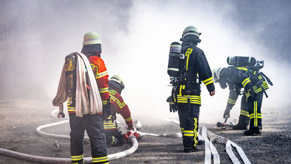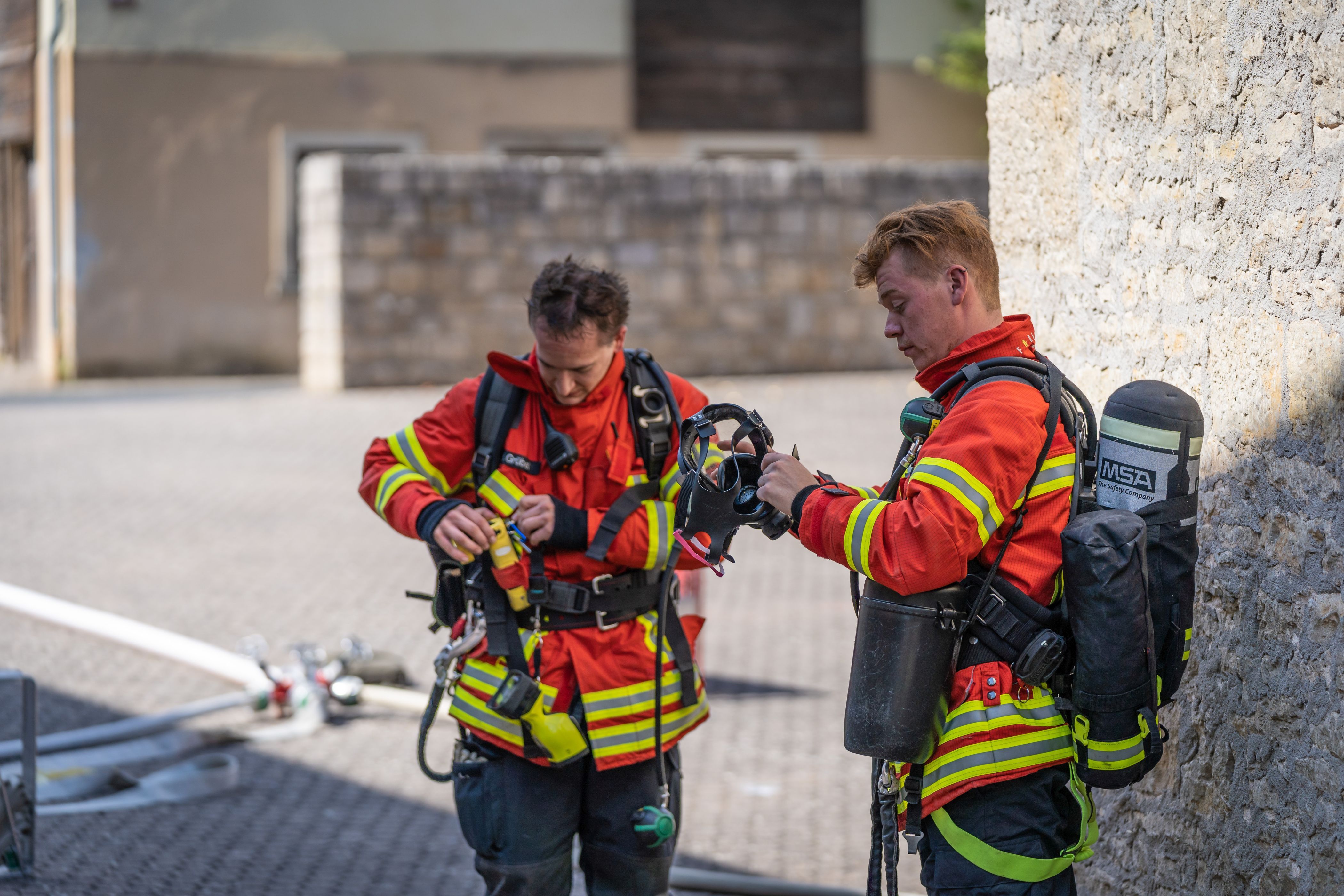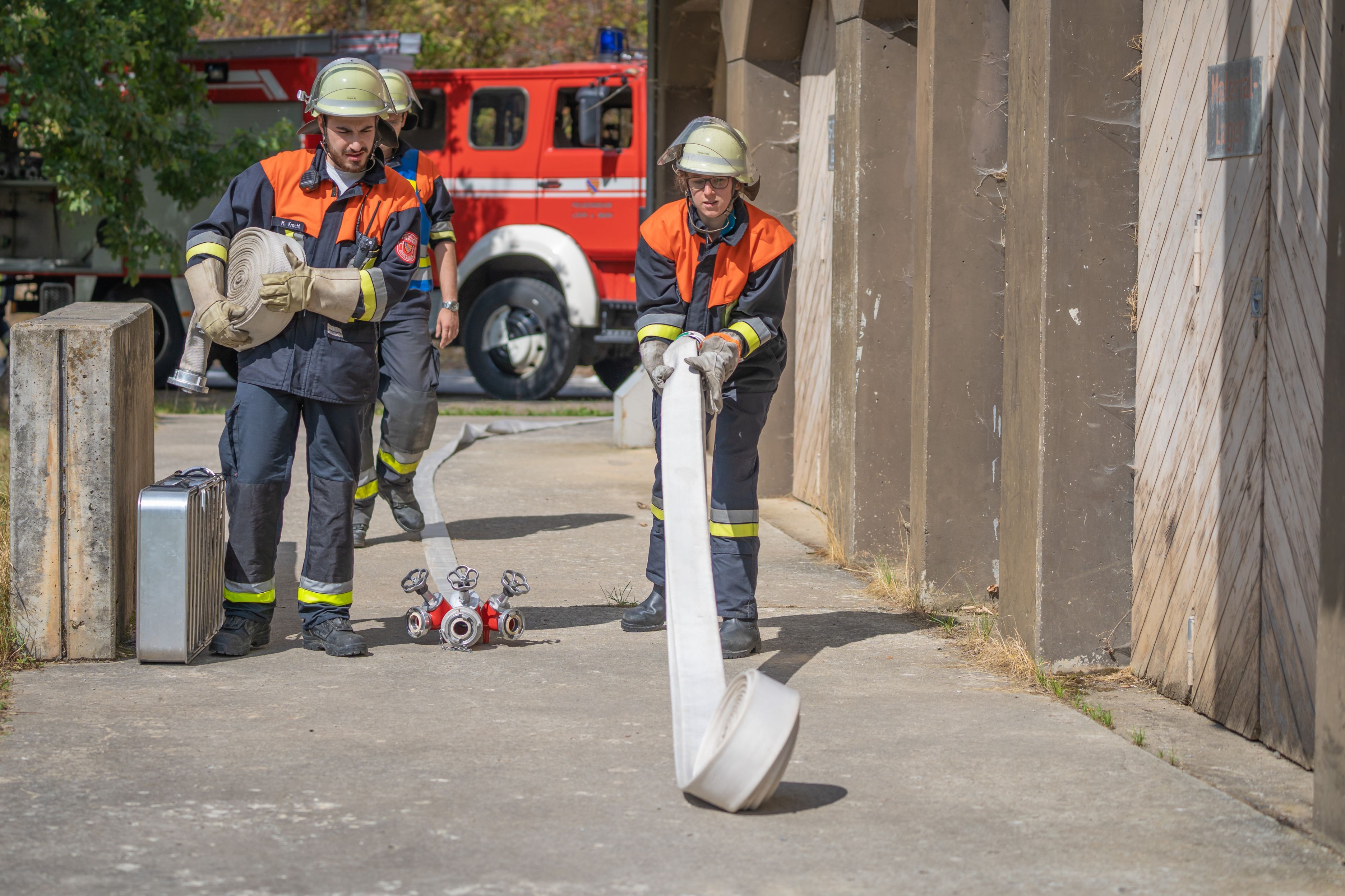 Nach der Mittagspause stand eine Übung auf dem Programm, bei der ein Konzept erprobt wurde, wie man bei einem Brand in einem Haus mit vielen Stockwerken vorgehen kann. Die Einsatzkräfte sollten in ein so genanntes Depotgeschoss vorgehen, das ein bis zwei Geschosse unterhalb der Brandetage liegt. Von dort sollte dann die Menschenrettung und Brandbekämpfung gestartet werden. Leider hatte sich das Treppenhaus schon mit Rauch gefüllt, sodass dieses erst mit Lüftern rauchfrei gemacht werden musste. Mit einem mobilen Rauchverschluss wurde das Treppenhaus vor weiterer Verrauchung aus der „Brandwohnung“ geschützt. Erst jetzt konnte wie geplant vorgegangen werden.