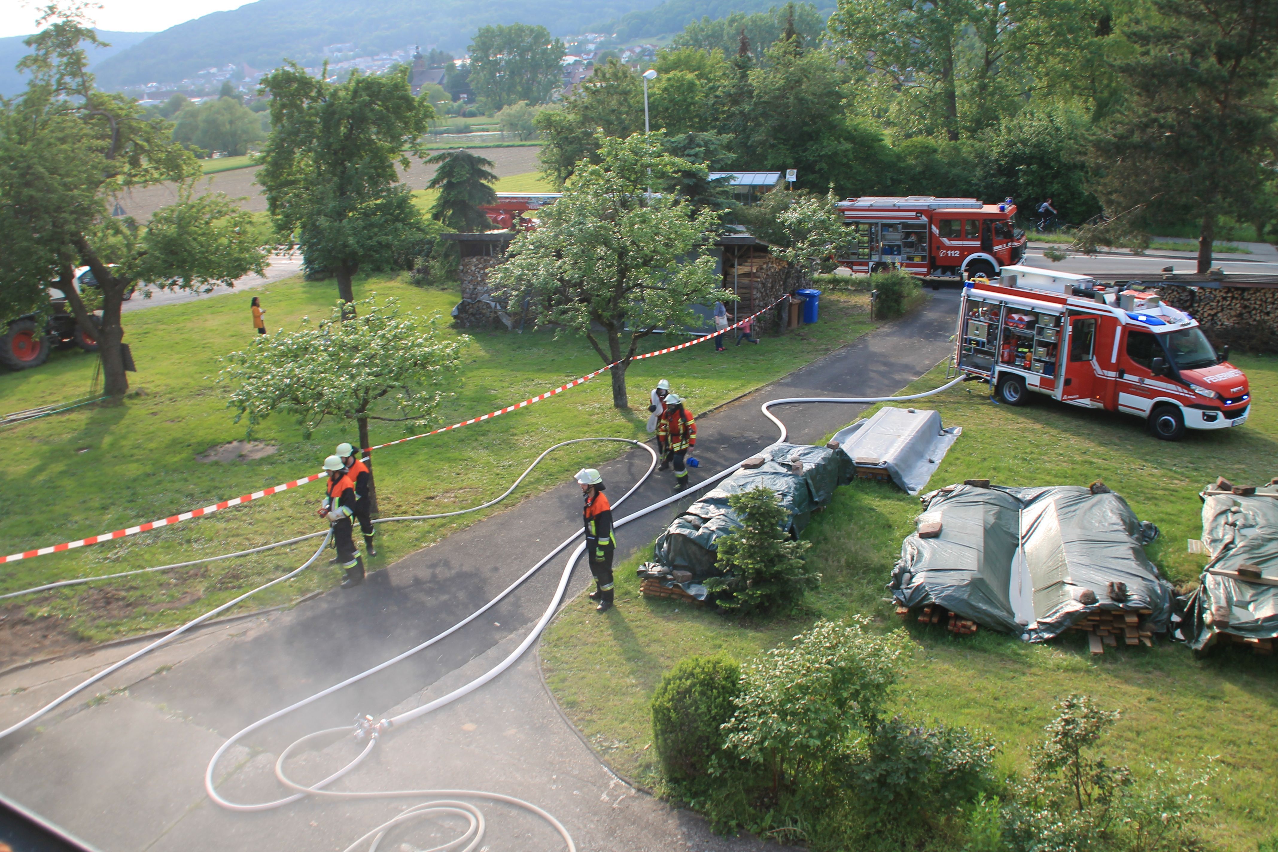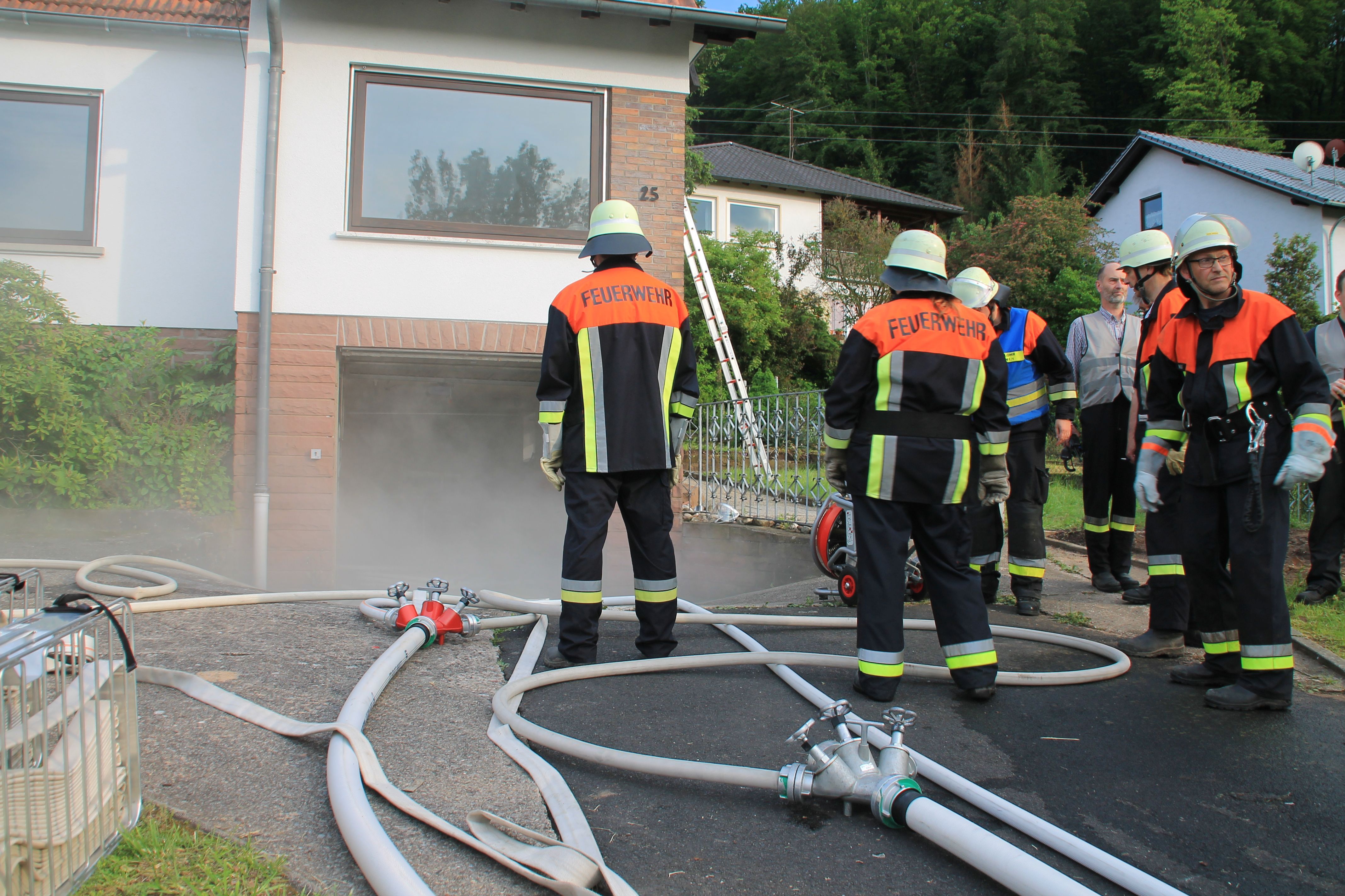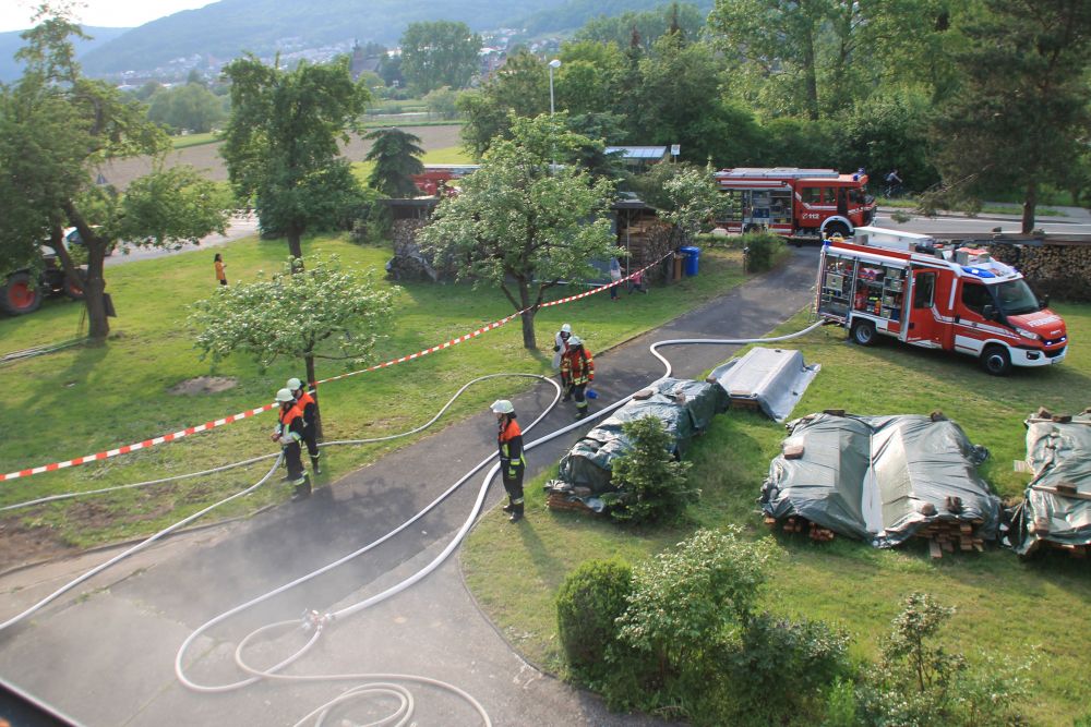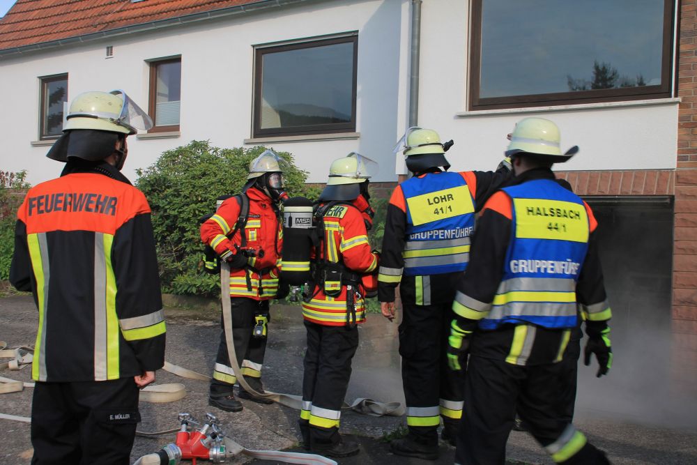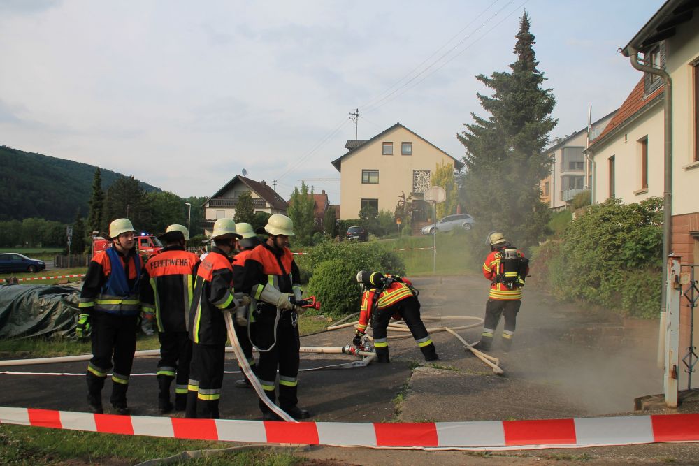 Zur Verstärkung mit Atemschutzgeräteträgern sowie einer Drehleiter wurde die Feuerwehr Lohr "nachalarmiert". Nachdem die Brandbekämpfung im Keller sowie die Menschenrettung erfolgreich abgeschlossen war, konnte "Übungsende" gegeben werden.
