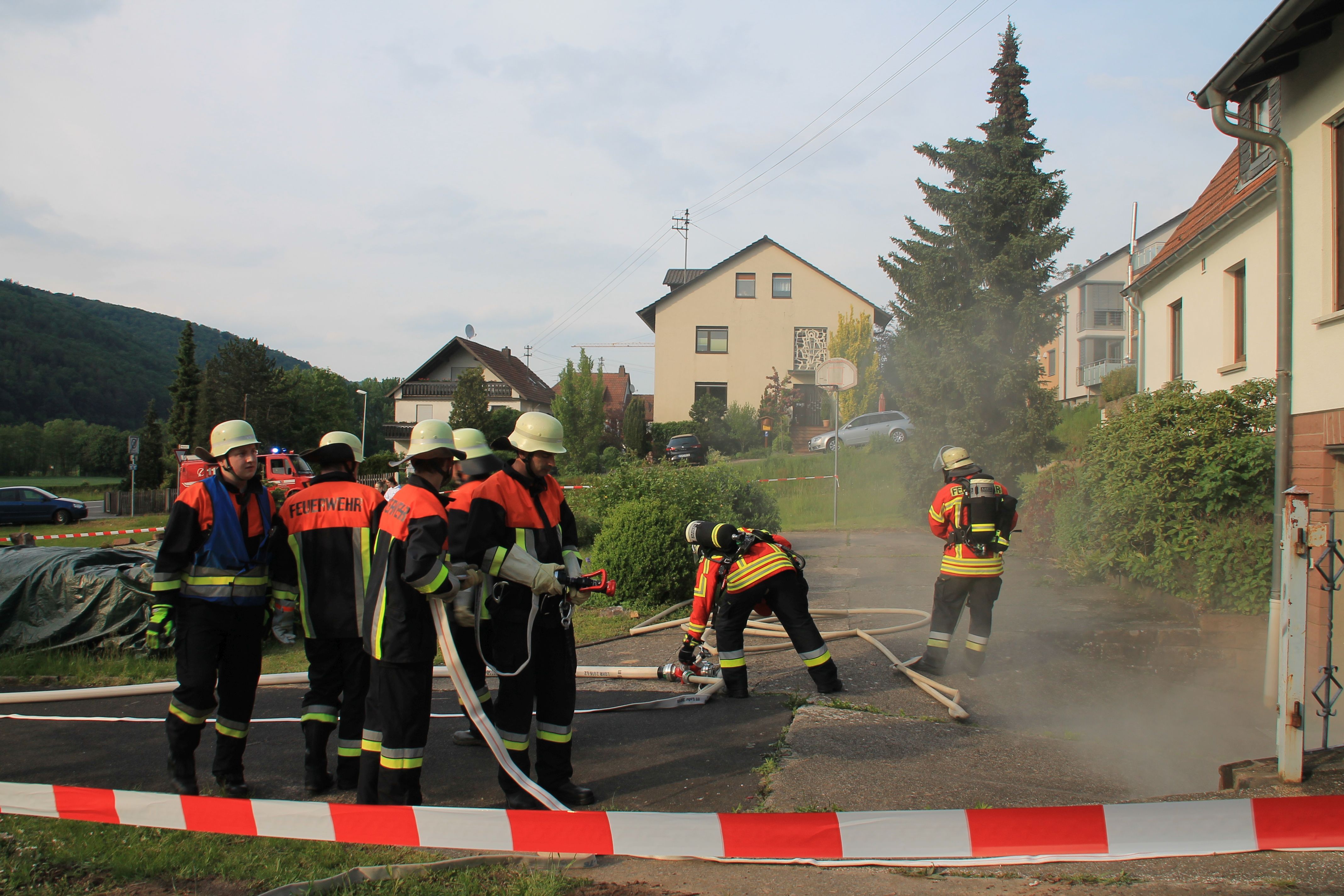 Die erst eintreffenden Kräfte aus Steinbach fanden folgende Lage vor: Bei Schweißarbeiten im Keller eines Einfamilienhauses war ein Brand ausgebrochen. Der Verursacher war in den Kellerräumen vermisst, die Enkelkinder (dargestellt durch Mitglieder der Jugendfeuerwehr Steinbach) konnten sich in verschiedene Räume und auf den Balkon retten.