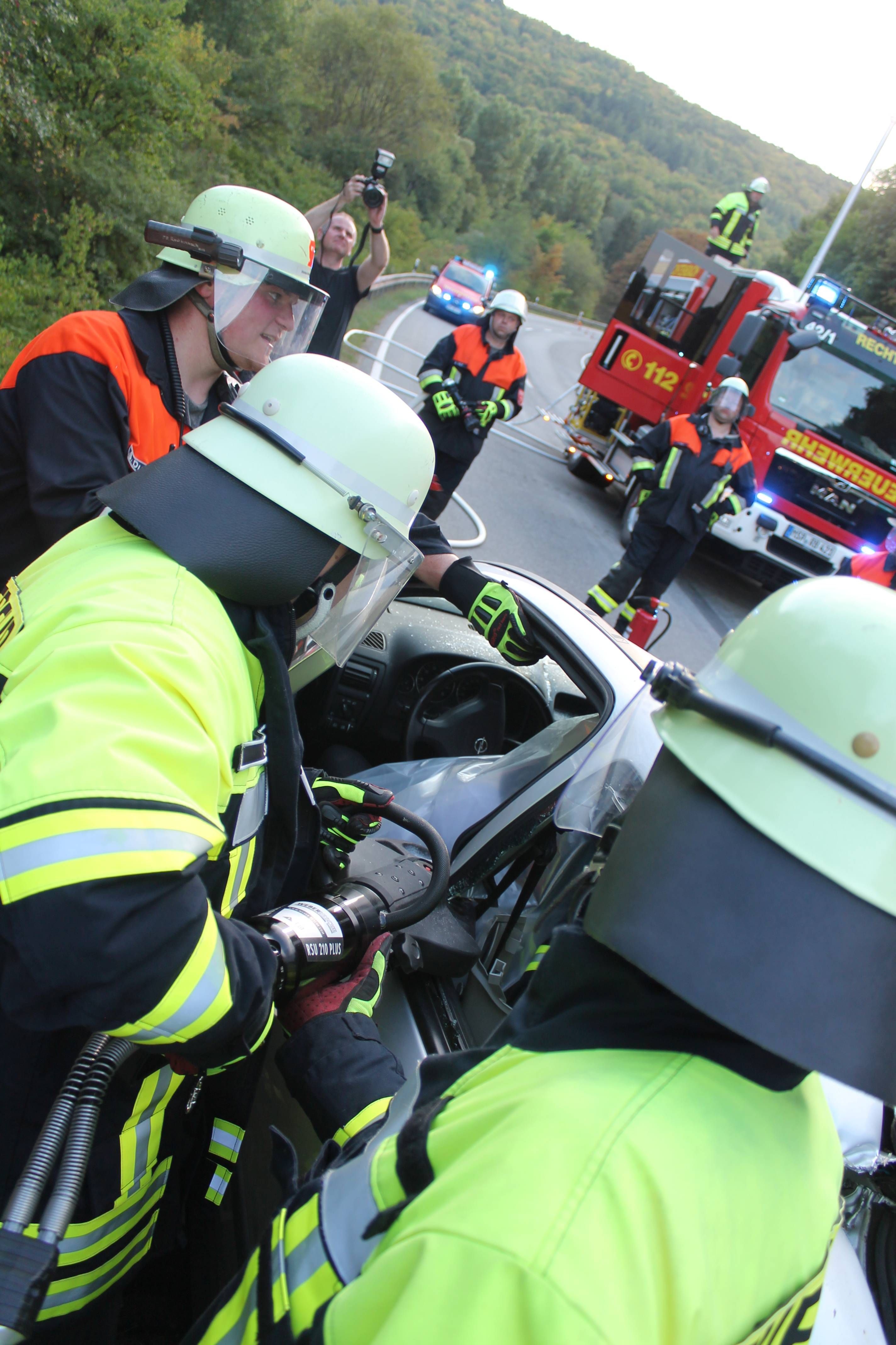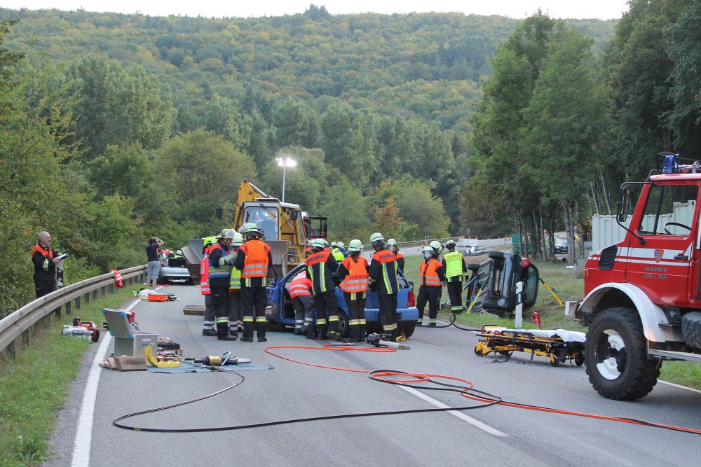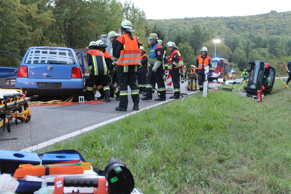 Auf der B26 auf Höhe der Wasserhauskurve wurde ein Verkehrsunfallsszenario mit vier Fahrzeugen dargestellt.