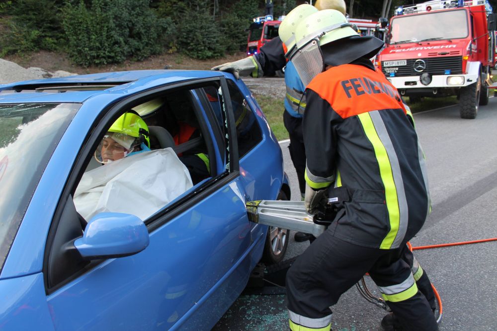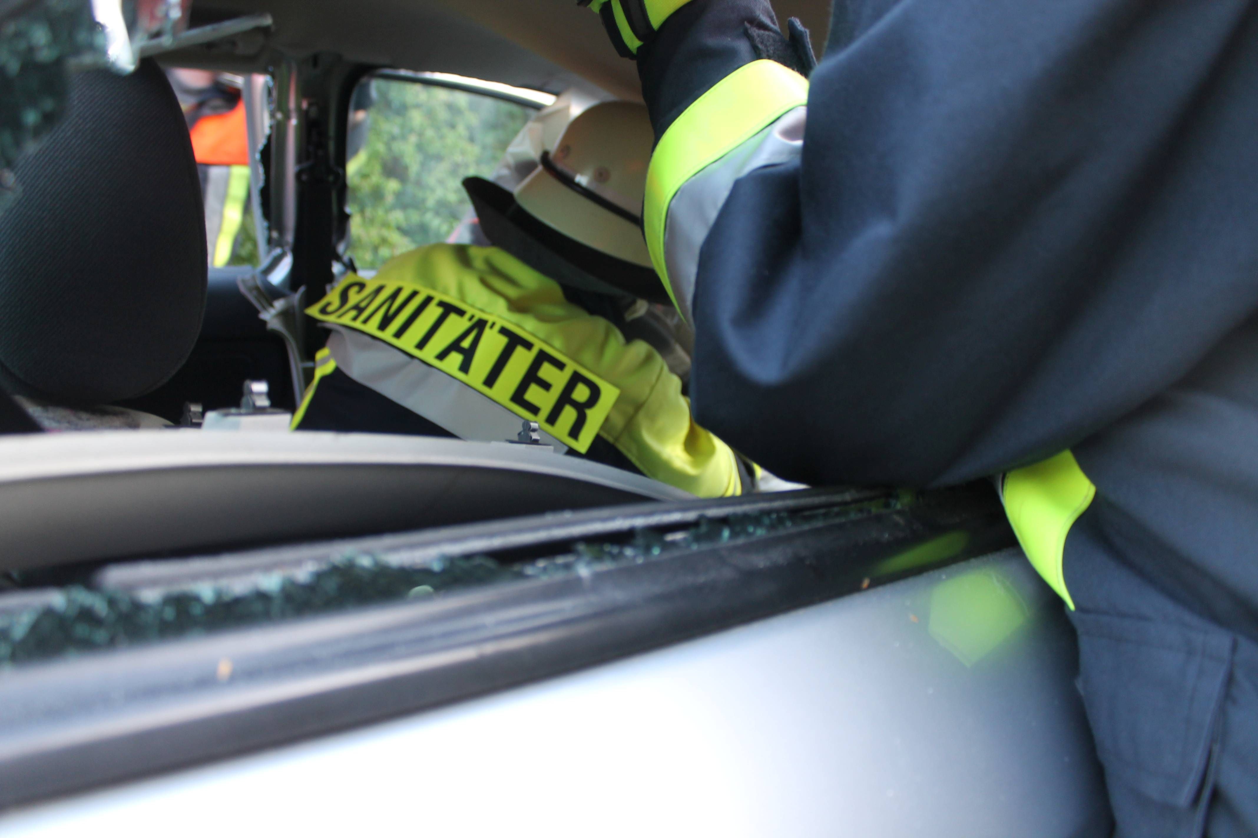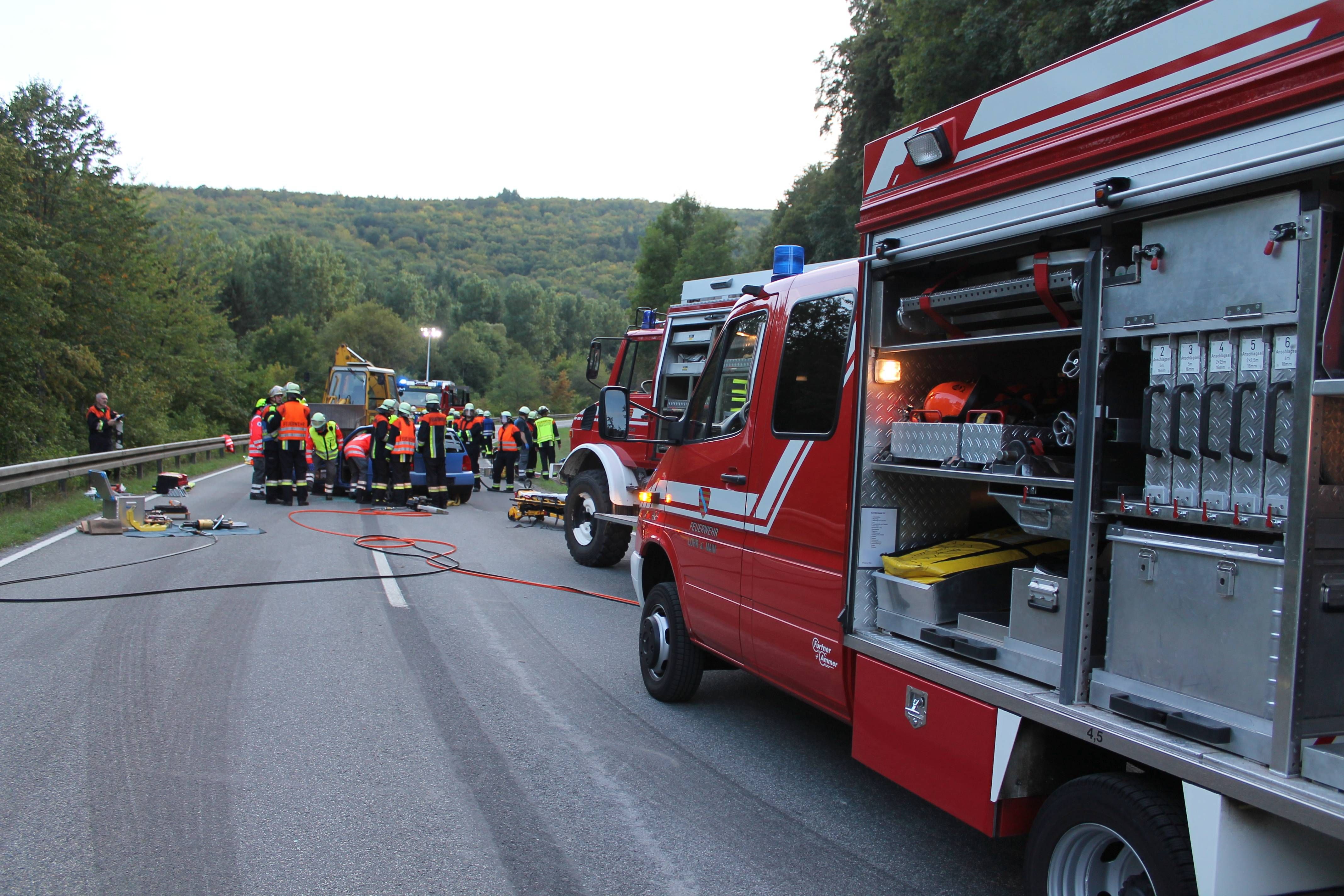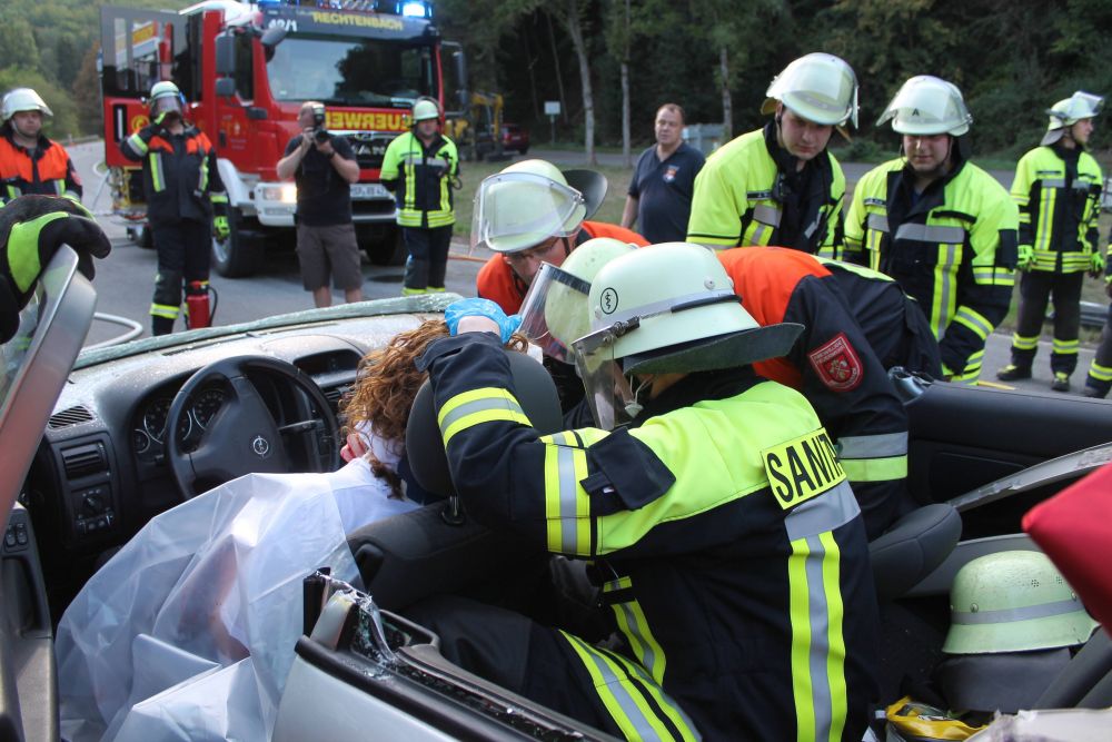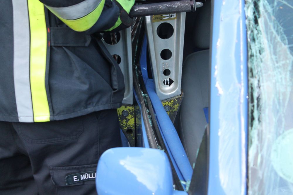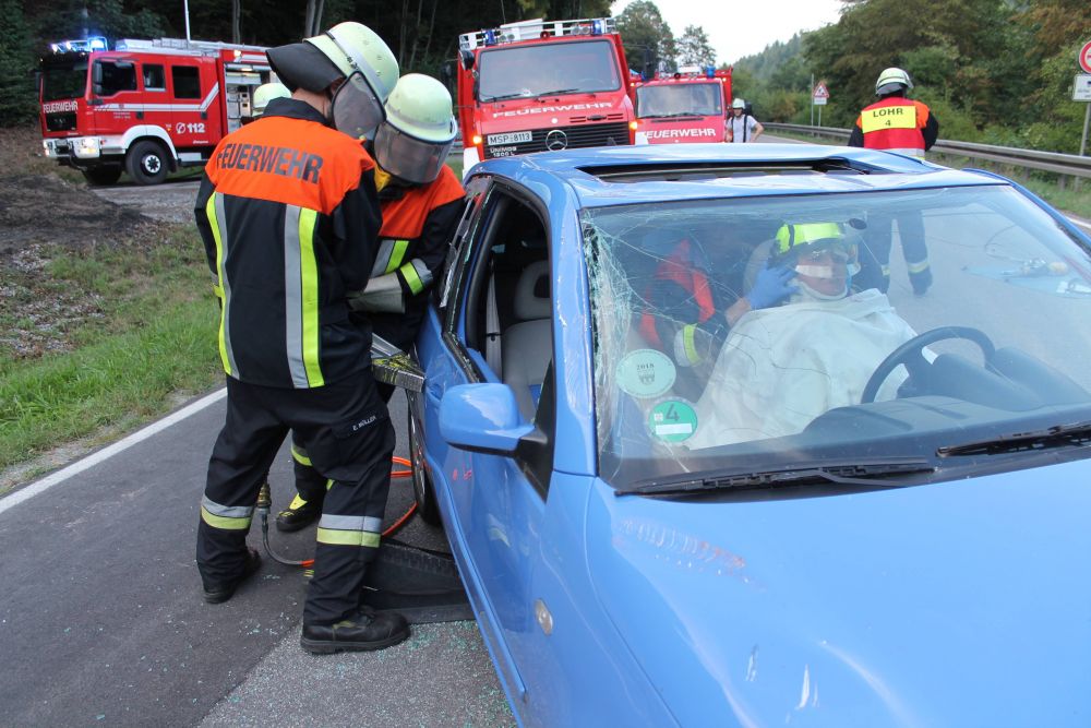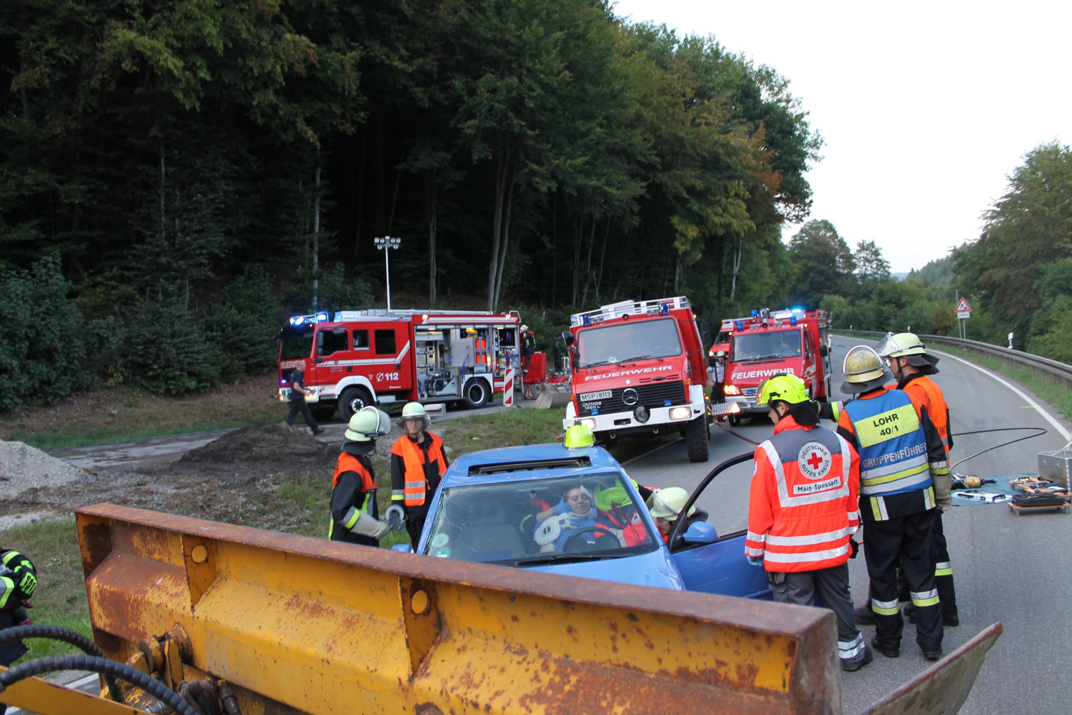 unter dem PKW zusammen mit dem Hilfeleistungslöschgruppenfahrzeug der Feuerwehr Lohr und Kräfte der FF-Rechtenbach. Die Feuerwehr Rechtenbach übernahm die Rettung der dritten eingeklemmten Person mit ihrem Hilfeleistungslöschgruppenfahrzeug. Hierzu wurde eine schonende Rettung vorbereitet und das Dach abgetrennt.