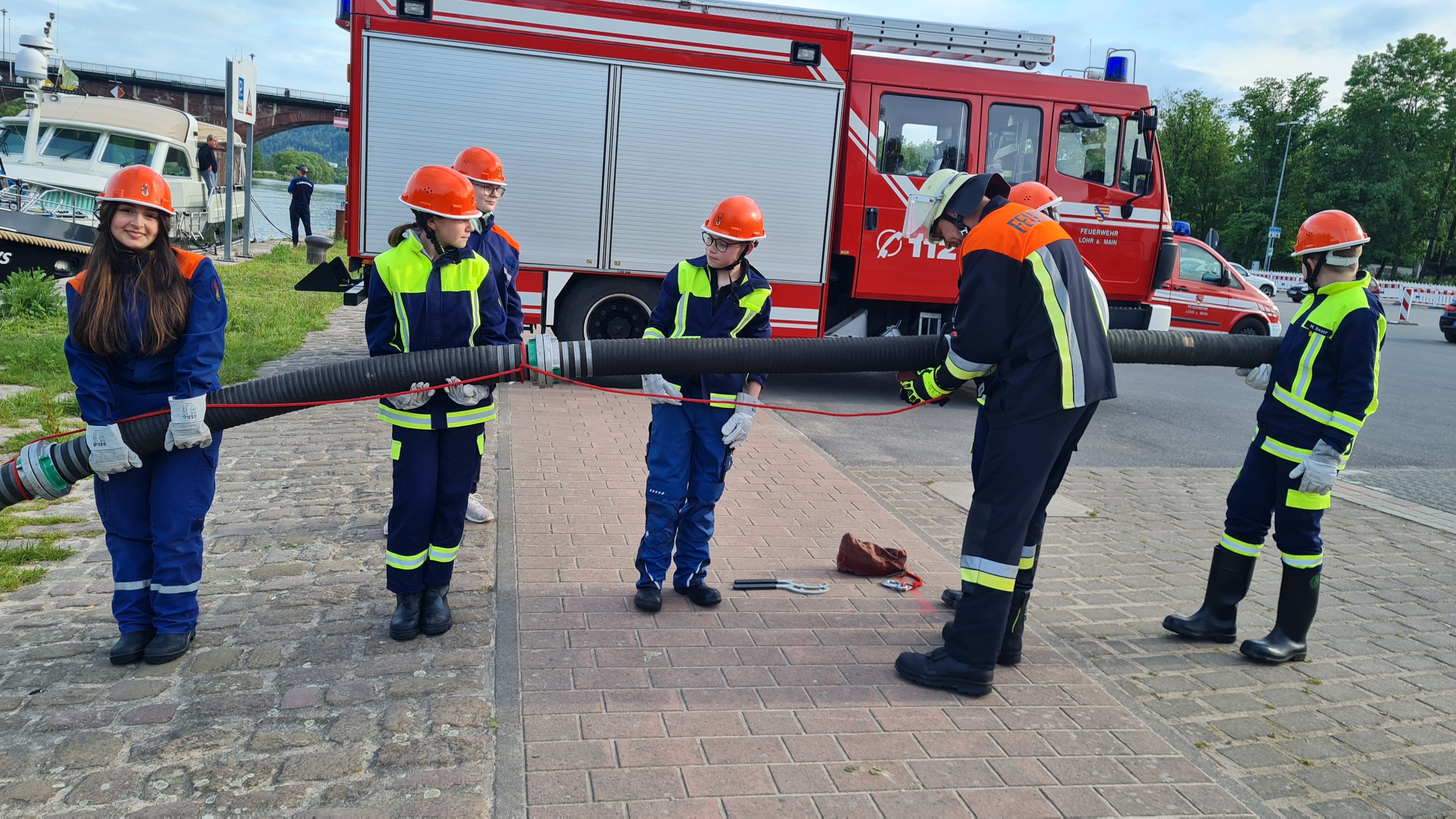 Um die Wartezeit zu verkürzen, waren die Jugendlichen auch an Land fleißig. Sie lernten Saugleitungen zu kuppeln und einen Faltbehälter aufzustellen. Anschließend stießen die Kinder hinzu und nutzten die Gelegenheit, ein wenig mit dem Schlauch herumzuspritzen. Dabei lernten die Kinder auch den Umgang mit dem Mehrzweckstrahlrohr kennen.