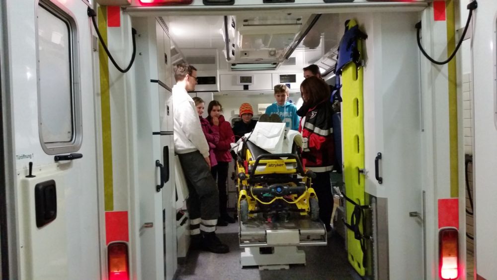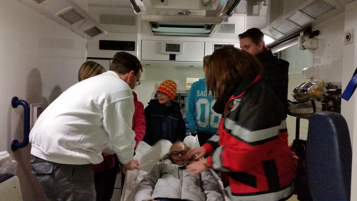 Zunächst wurde die Trage untersucht. Die Kinder fanden diese sofort sehr bequem, würden sie aber doch nicht mit Ihrem eigenen Bett daheim tauschen wollen. Interessant ist, dass auch für den Patienten Anschnallpflicht gilt.