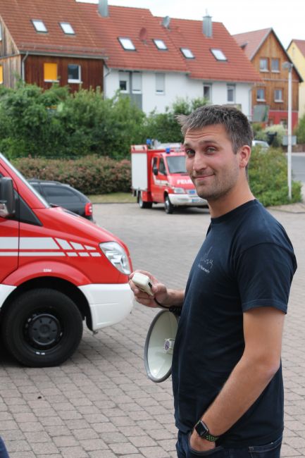 Die erst eintreffenden Kräfte aus Steinbach fanden folgende Lage vor: Bei Schweißarbeiten im Keller eines Einfamilienhauses war ein Brand ausgebrochen. Der Verursacher war in den Kellerräumen vermisst, die Enkelkinder (dargestellt durch Mitglieder der Jugendfeuerwehr Steinbach) konnten sich in verschiedene Räume und auf den Balkon retten.