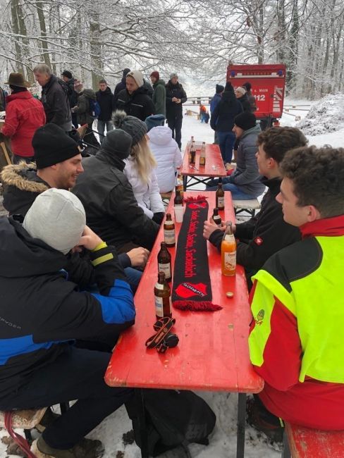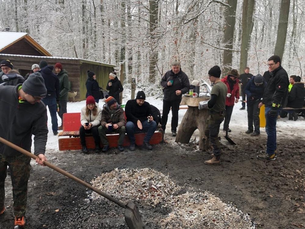 Nach einer kleinen Winterwanderung gesellte man sich zusammen an der Beilsteinhütte um’s große Lagerfeuer herum. Mehrere Zentimeter Schnee und niedrige Temperaturen sorgten für die stimmige Atmosphäre. Das Vorbereitungsteam hat auch dieses Jahr wieder den Geschmack der Gäste getroffen und von jedem positives Feedback zu Fleischwurst, Kartoffeln mit Kräuterquark oder dem selbstgemachten Lakefleisch bekommen.