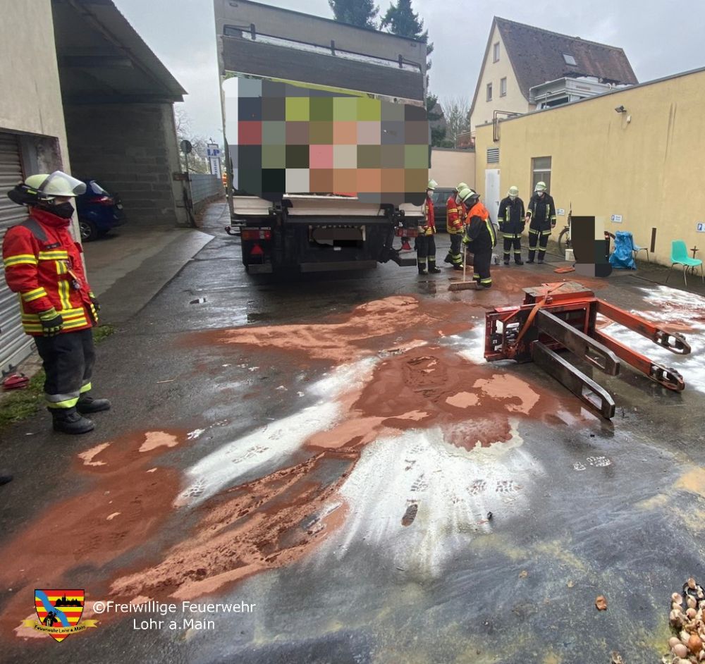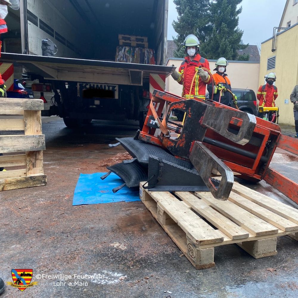 Die Feuerwehr Lohr wurde zu auslaufender Batteriesäure in einem Hinterhof, welche aus einem umgestürzten Elektrostapler ausgelaufen war.