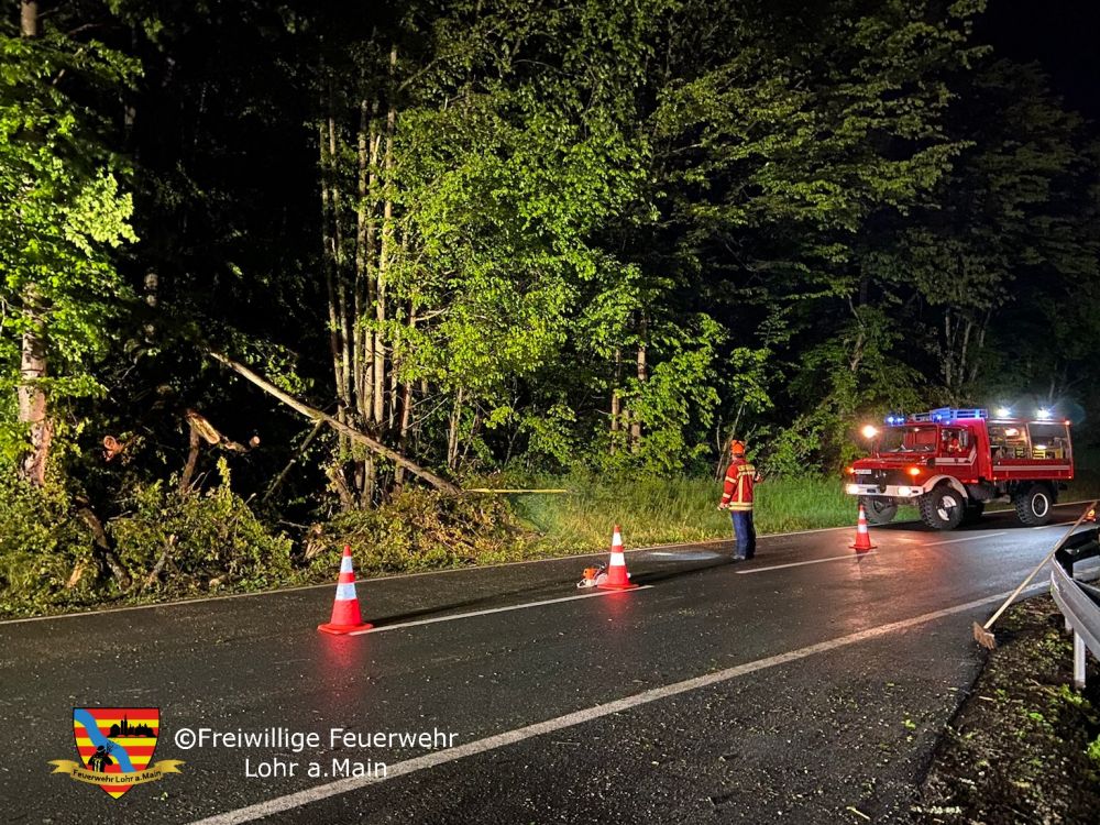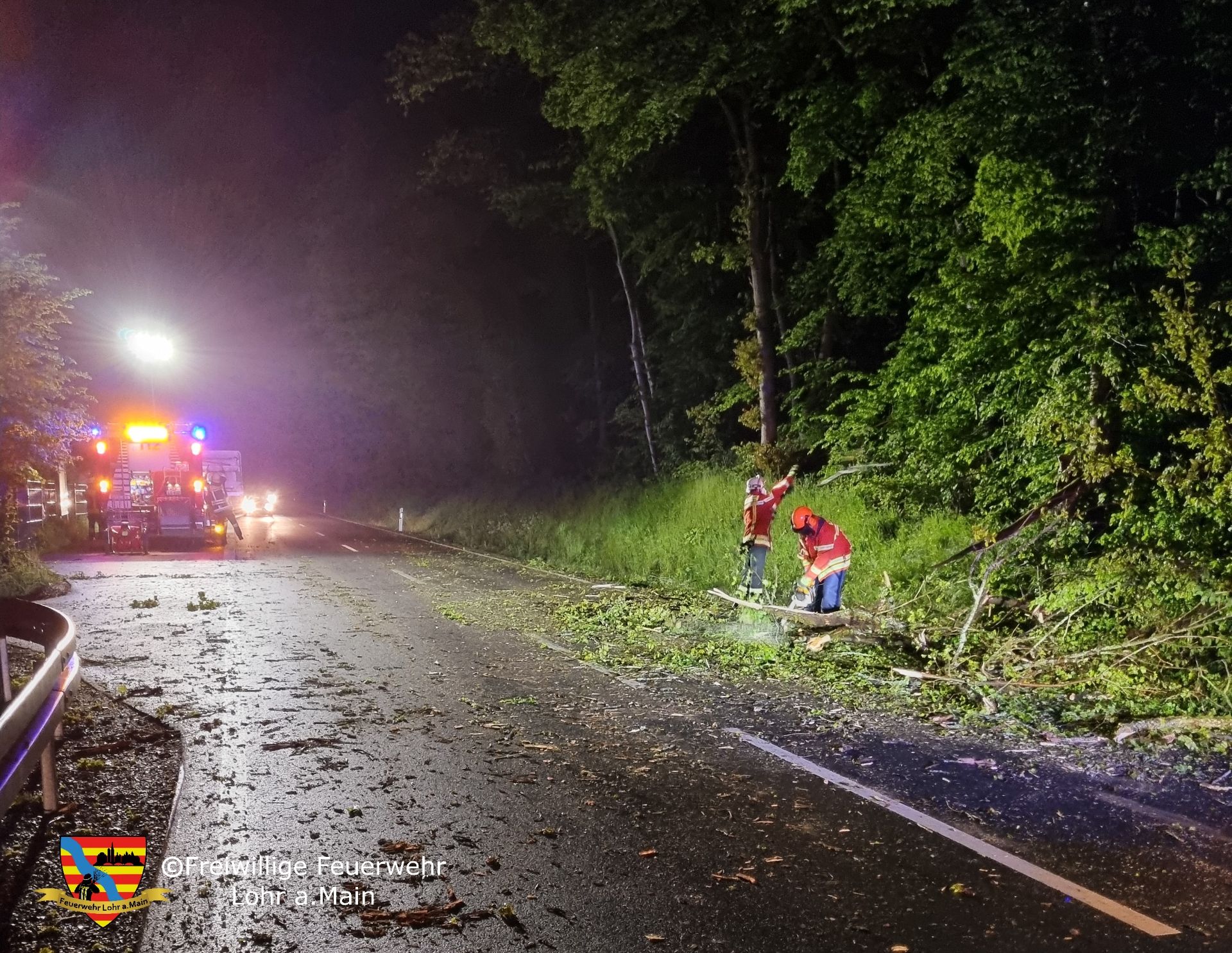 Die Krone eines größeren Baumes blockierte die Fahrspur Richtung Rechtenbach der B26. Die Krone wurde mit der Motorsäge entfernt und die Straße besenrein hinterlassen.