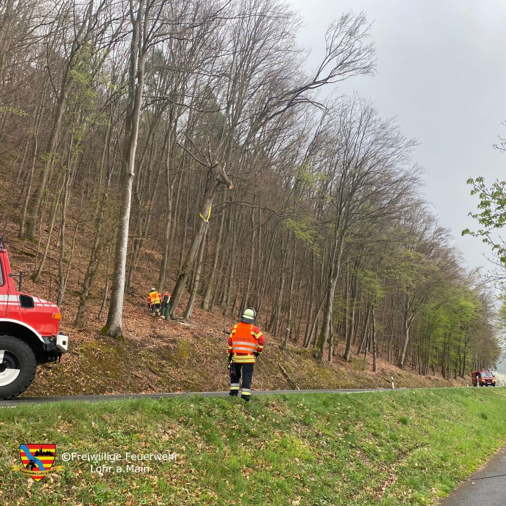 Nach Übersendung von Bildmaterial und anschließender telefonischer Rücksprache mit eine professionellen Holzrücker, wurde beschlossen den Baum zu fällen. Dazu wurde ein Alarm für die Feuerwehr Lohr ausgelöst. Die Feuerwehr Pflochsbach, welche bereits zuvor schon in der Meldekette eingebunden war, stellte ebenfalls Einsatzbereitschaft her und fuhr die Einsatzstelle an.