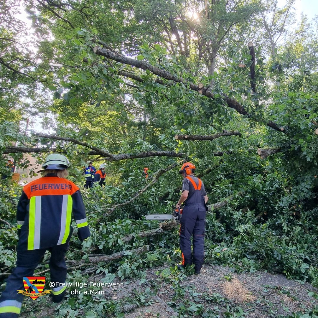 Zwei große Bäume waren auf der Willi-Bleicher-Str. umgefallen. Die Feuerwehren aus Lohr und Lohr-Sackenbach beseitigten die Bäume mittels Kettensäge und reinigten die Fahrbahn grob.
