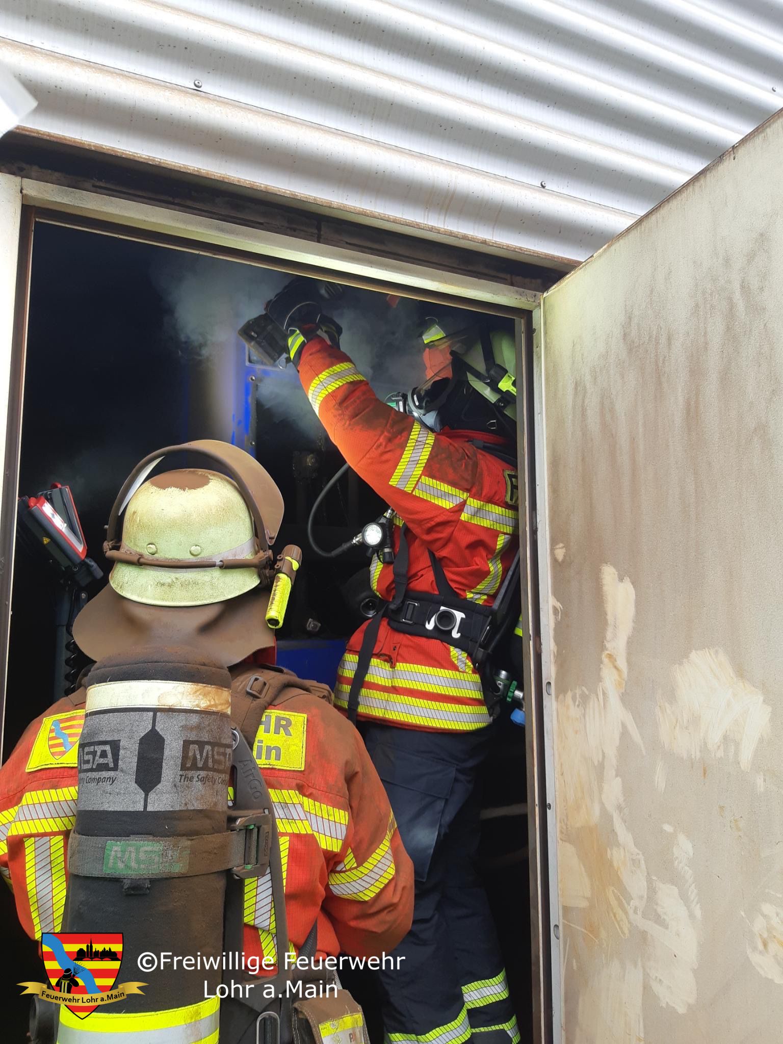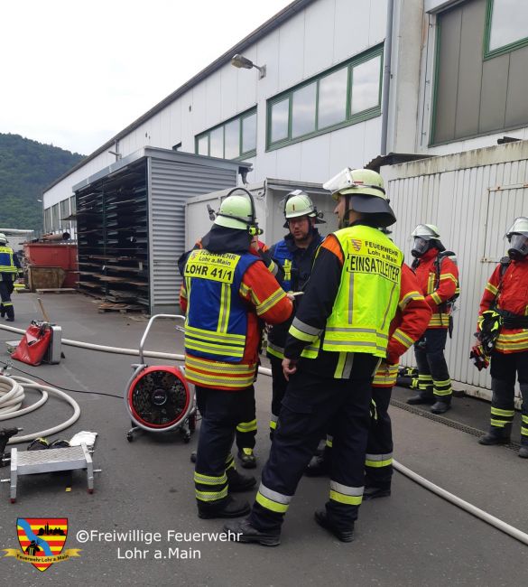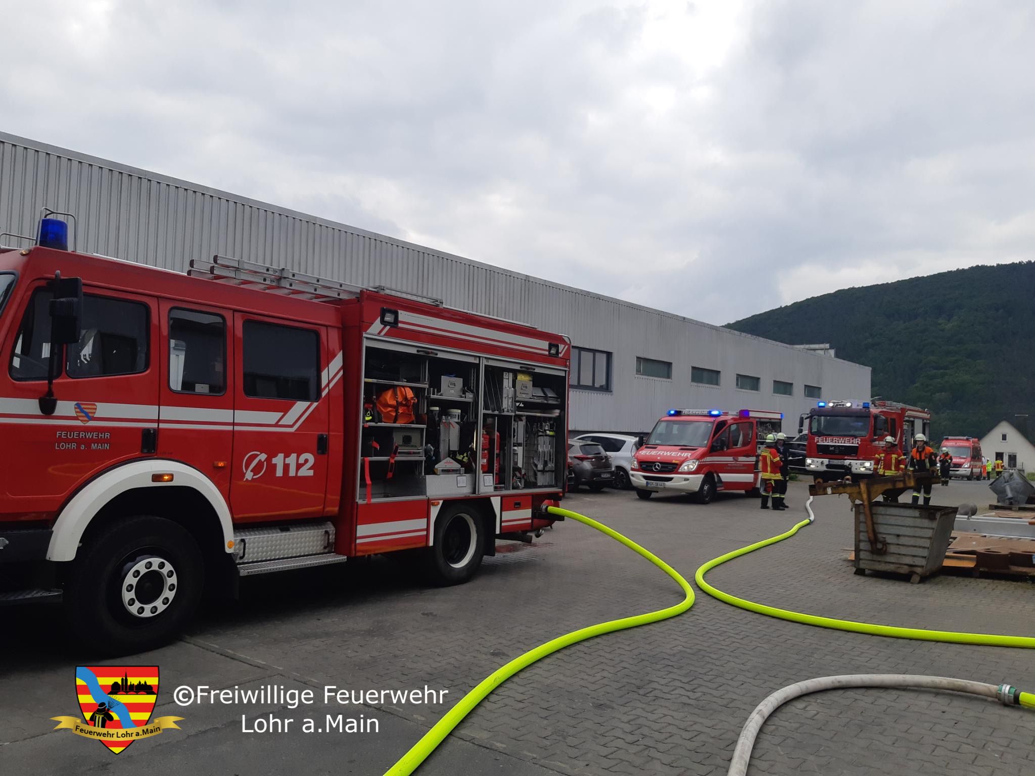 Die Feuerwehr Lohr ist mit Kommandowagen, Einsatzleitwagen, Löschgruppenfahrzeug 16/12, Drehleiter und Hilfeleistungslöschgruppenfahrzeug 20/16 ausgerückt, die Feuerwehr Sackenbach ist mit dem Tragkraftspritzenfahrzeug.