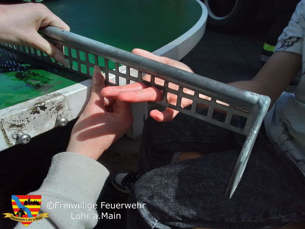 Vor Ort stellte sich die Lage wie gemeldet dar. Ein Junge hatte 2 Finger in einem Metallnetz einer Tischtennisplatte eingeklemmt. Durch die Schwellung der Finger konnten diese nicht mehr herausgezogen werden.