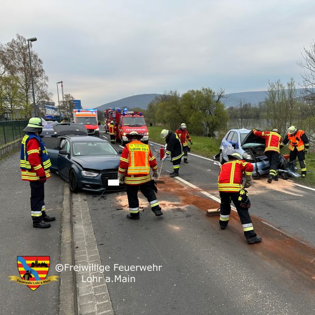Die Einsatzkräfte der Feuerwehr Lohr, Rodenbach und Neustadt wurden zu einem Verkehrsunfall auf der Rodenbacher Str. Höhe Firma Hunger alarmiert. Eine erste Lage ergab zwei frontal miteinander kollidierte PKW. Der Fahrer des ersten PKW hatte das Fahrzeug selbstständig verlassen können. Der Fahrer des anderen PKWs war auf dem Fahrersitz befindlich eingeklemmt und musste mittels hydraulischen Rettungsgeräts befreit werden.
