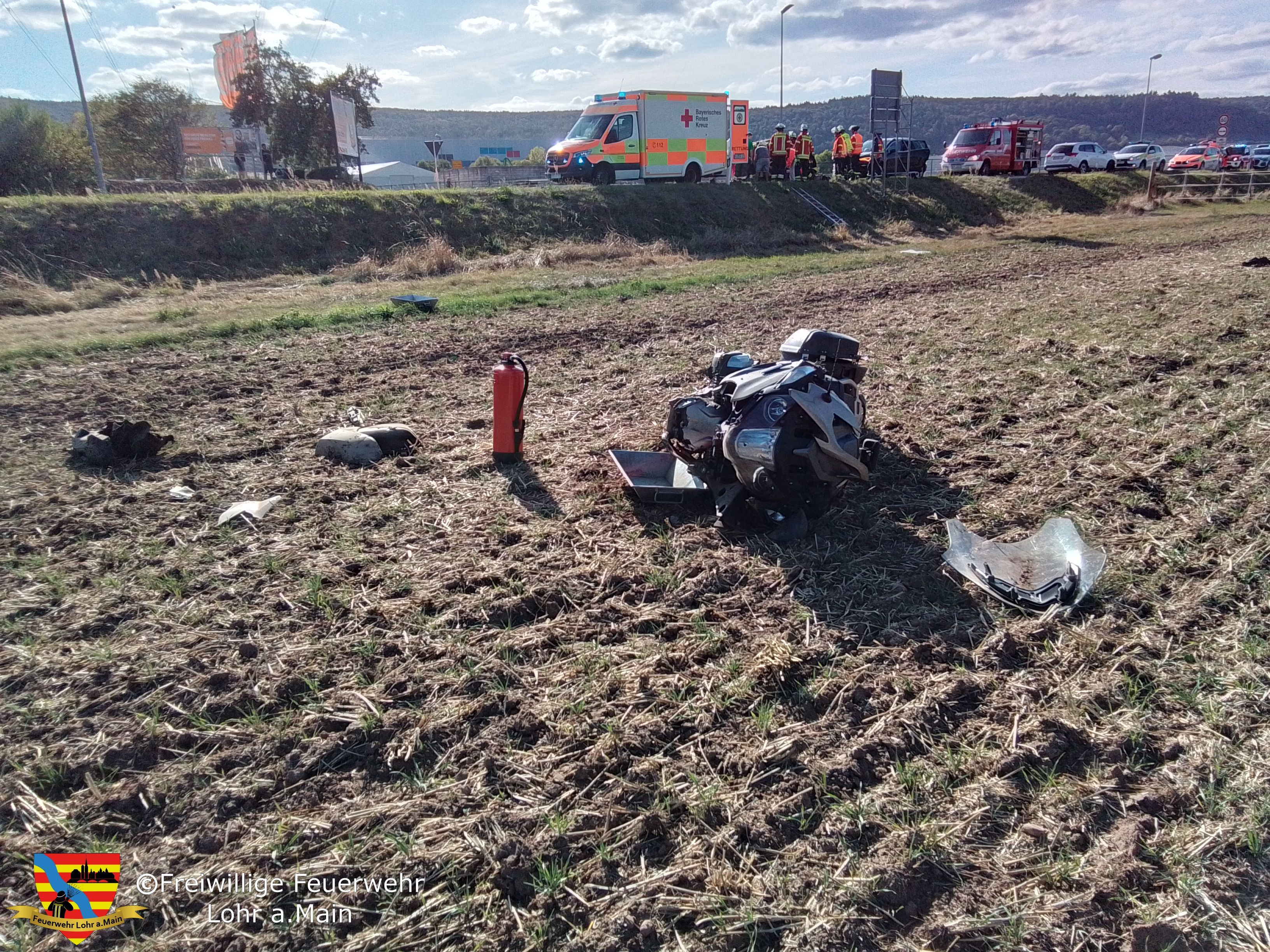 Bei Eintreffen der Feuerwehr wurde der Motorradfahrer bereits durch Ersthelfer und den Rettungsdienst versorgt. Die Feuerwehr unterstützte den Rettungsdienst beim Abtransport der verletzten Person vom Acker in den Rettungswagen. Zur Landung des Rettungshubschraubers wurde für die Dauer des Rettungsdienst- und Feuerwehreinsatzes der Kreuzungsbereich und die St 2315 voll gesperrt.
