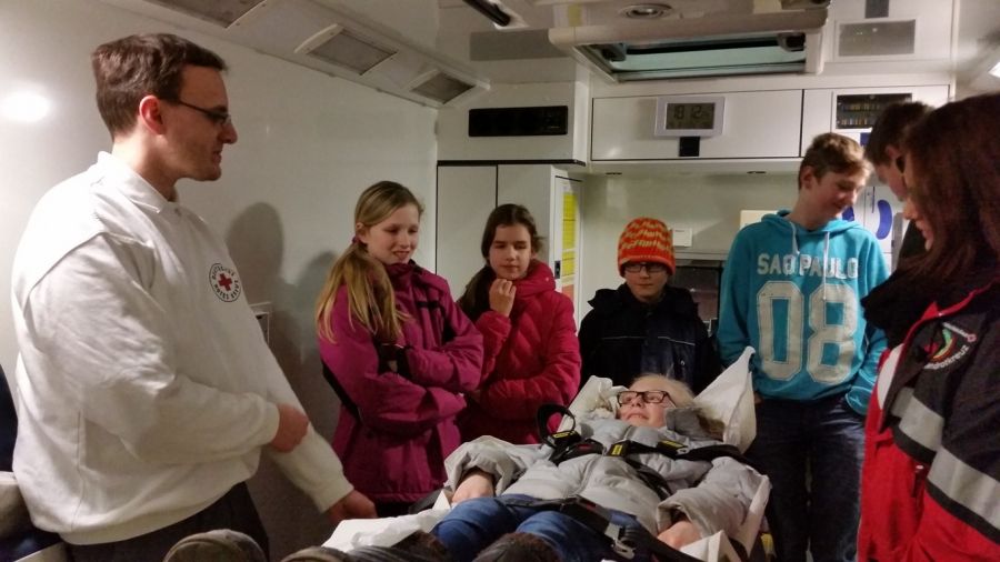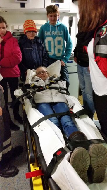 Zunächst wurde die Trage untersucht. Die Kinder fanden diese sofort sehr bequem, würden sie aber doch nicht mit Ihrem eigenen Bett daheim tauschen wollen. Interessant ist, dass auch für den Patienten Anschnallpflicht gilt.