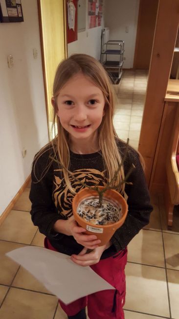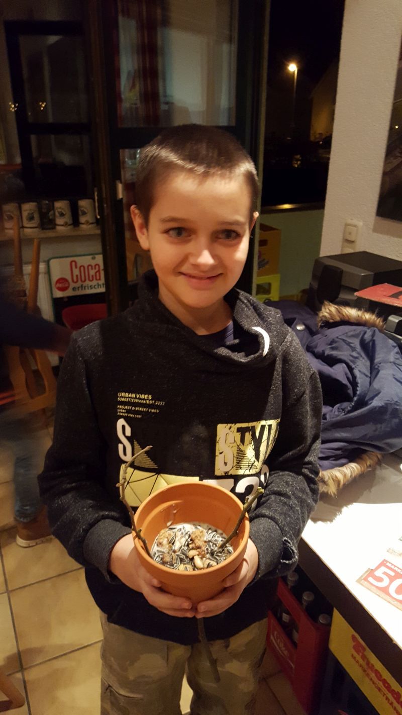 In Kleingruppen durfte jeder aus einer Mischung von möglichen Zutaten für das Vogelfutter wählen (Fettfutter, Sonnenblumenkerne natur und geschält, Leinsamen, Erdnussbruch...) und diese abwiegen. Nachdem das Rinderfett langsam in großen Töpfen geschmolzen war, mussten die Sämereien mit einem großen Holzkochlöffel untergerührt und schließlich die fertige Mischung in die vorbereiteten Tontöpfe (mit einem Ast als Landehilfe) abgefüllt werden.